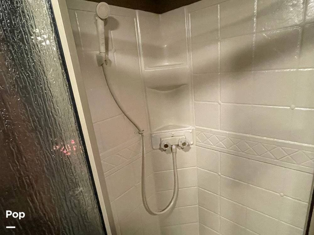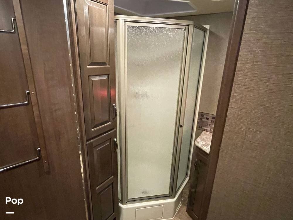There is a full bathroom with a privacy door that can be accessed when the slide is open or closed. The large slide-out spans almost the whole length of the living space, giving you extra space for entertaining.