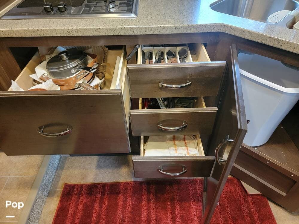 Step into the kitchen and you'll feel right at home. The residential-style setup includes an 11 cu. ft. stainless steel refrigerator, countertops, a 3-burner range, and a convection microwave--all laid out with smart storage and a pull-out pantry.
