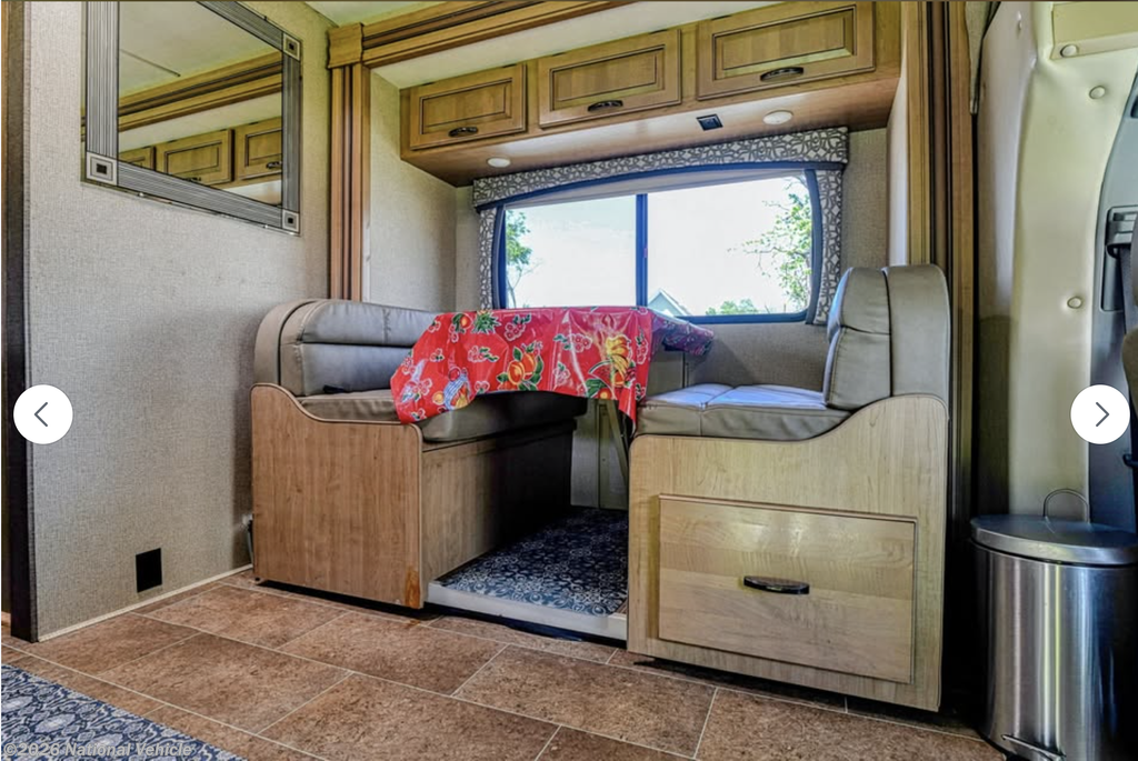 Class C motorhome layout designed to sleep up to six comfortably (captain?s chairs, cab-over bunk, rear bed, dinette conversion).