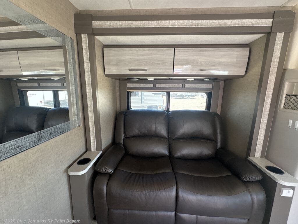 Load up your family and head out across the country or to a nearby campground with this Compass Class C diesel motorhome. Above the cab is a large skylight which allows plenty of natural lighting to shine through, and the LED lighting that has been included throughout the interior will illuminate the entire space once the sun has set. Cleaning up from a long day outdoors will be a breeze with the 27" x 27" neo-angled shower in the full bathroom, and cooking up a delicious dinner to feed the hungry crowd will be easy to do with the help of the 2-burner cooktop and convection microwave. You will love the rear bedroom area with its two twin-size beds that can convert into one large king-size bed whenever needed, and the 32" TV will allow you to watch your favorite movies as you drift off to sleep.