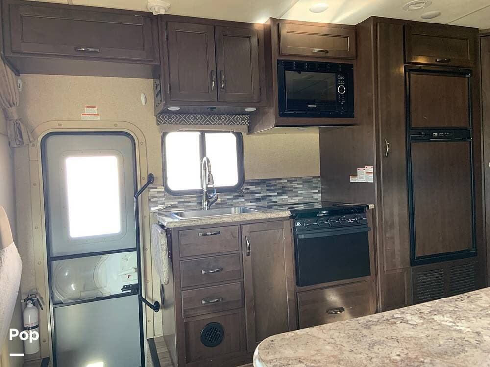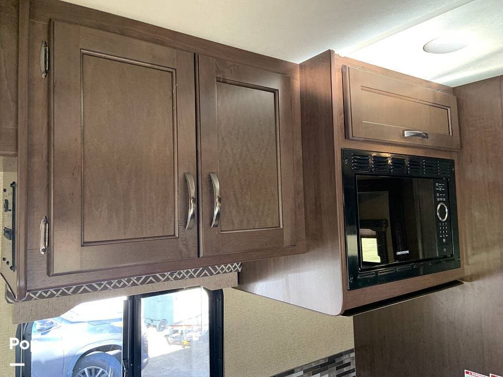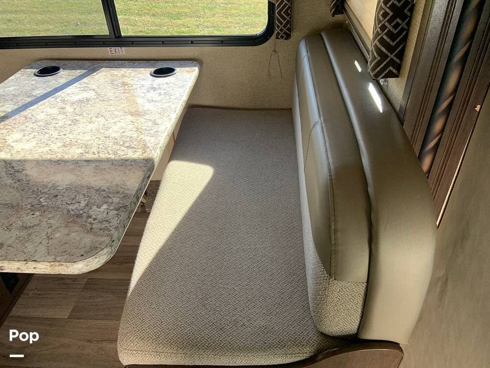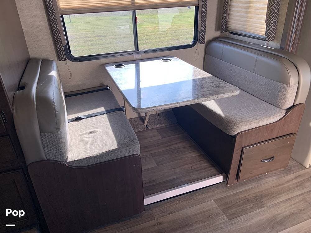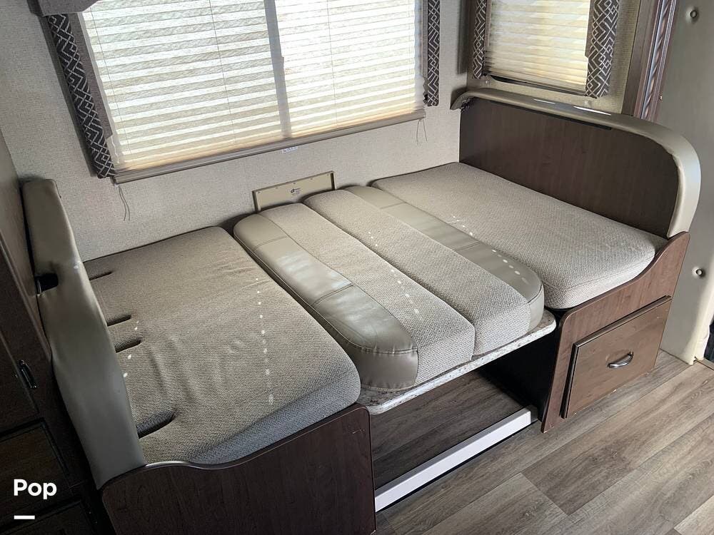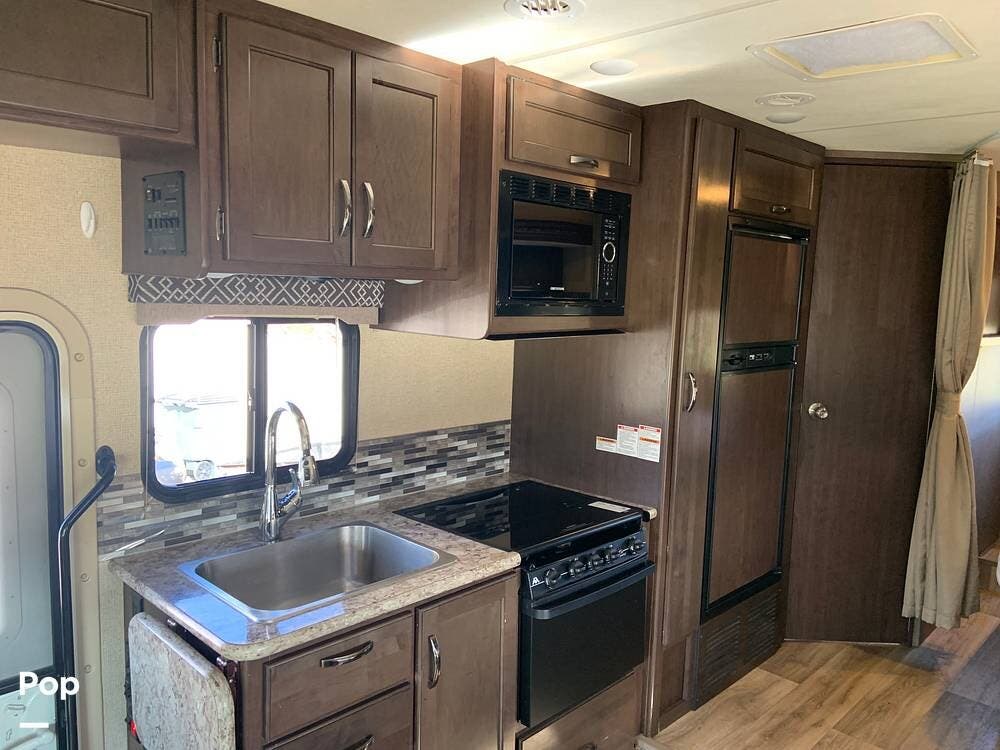 The coach has one large slide and a roomy interior given it's size at just under 25 feet. It sleeps six and offers a queen bed, cabover bunk and convertible dinette.