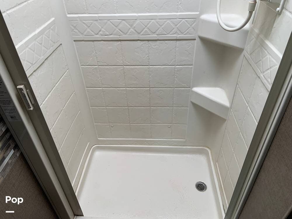 The full bath is a nice size and features a 24"x36" shower with a retractable door, a foot-flush porcelain toilet, and a vanity sink and medicine cabinet.