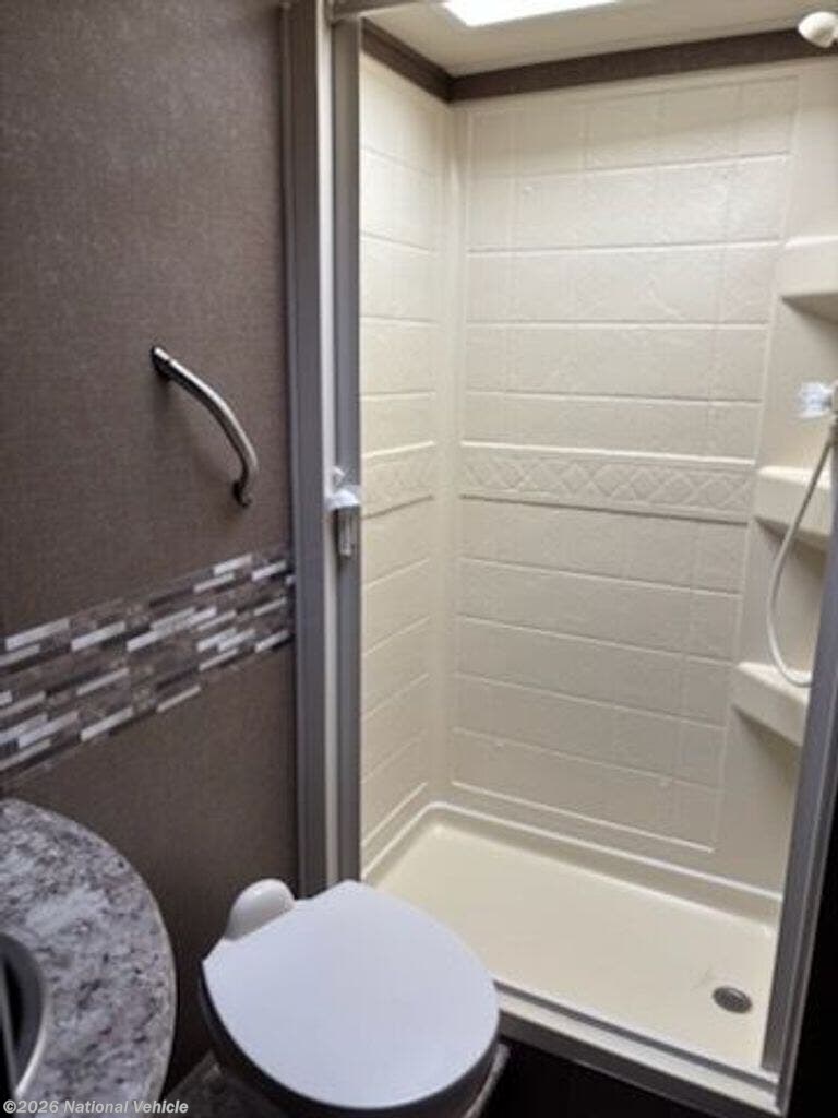 The fully equipped kitchen makes meal preparation easy with a three-burner cooktop, oven, microwave, refrigerator, and ample storage for all your essentials. The full rear bathroom with shower adds convenience and privacy, giving you all the comforts of home while on the road.