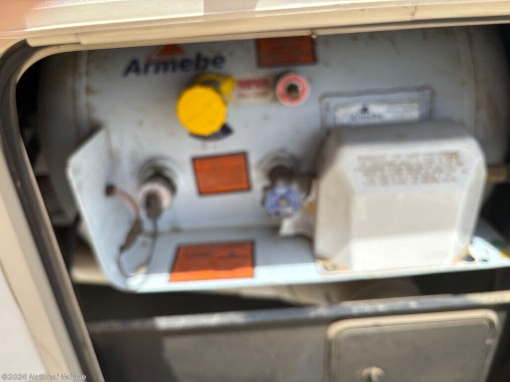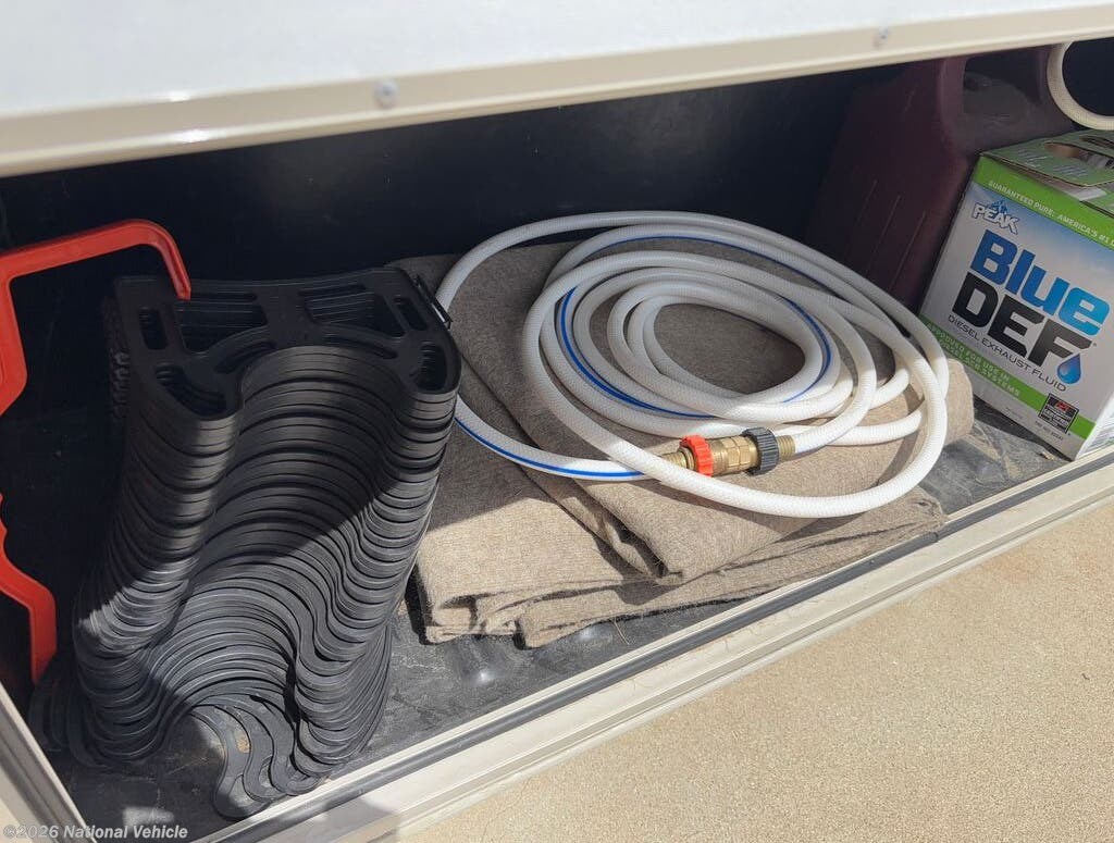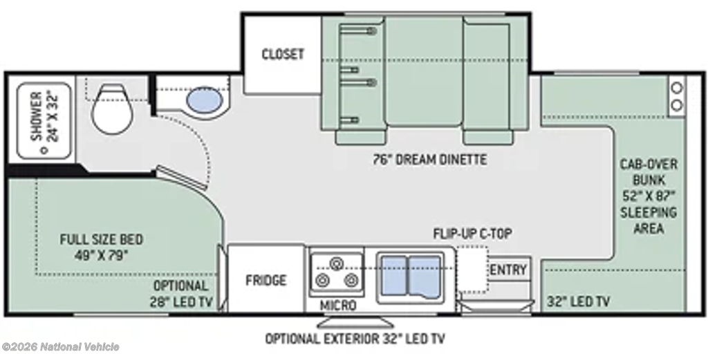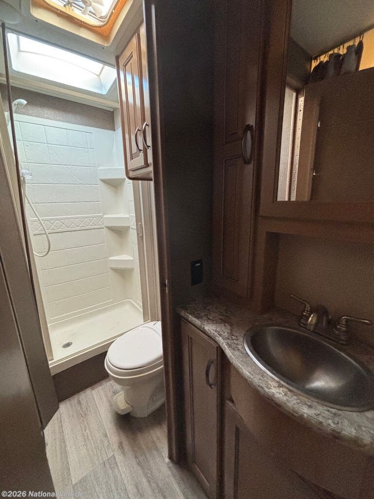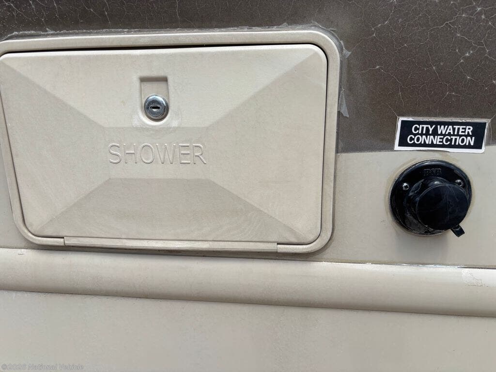 The fully equipped kitchen offers premium functionality with a three-burner cooktop, microwave, refrigerator, and ample storage, allowing you to prepare meals with ease wherever the road leads. At the rear, a private bathroom with a full shower and refined fixtures adds a residential touch of convenience and comfort. The sleeping quarters deliver a peaceful retreat, while the over-cab bunk provides additional resting space without compromising livability.