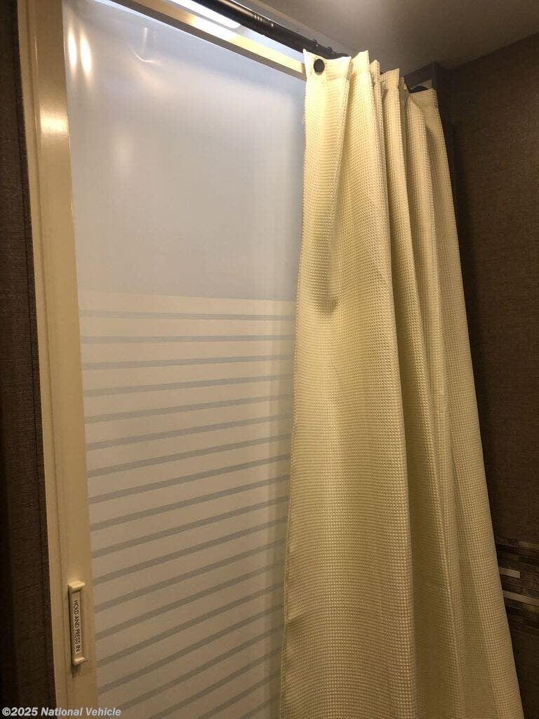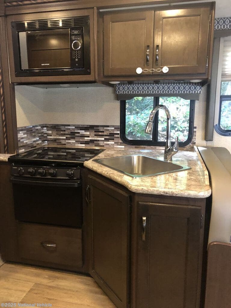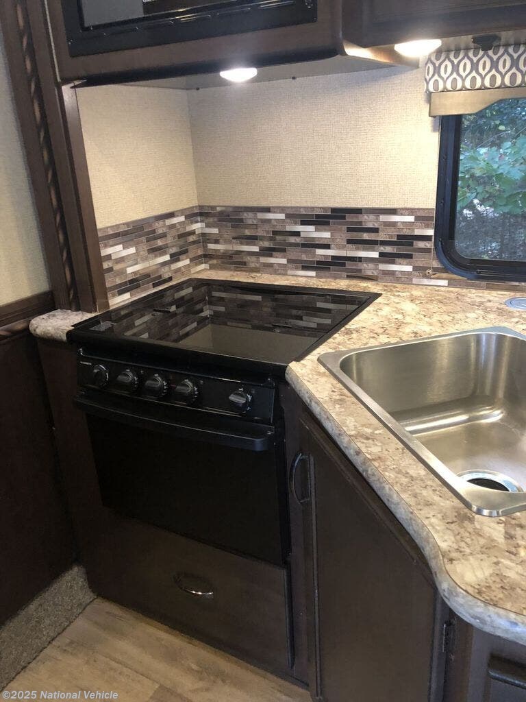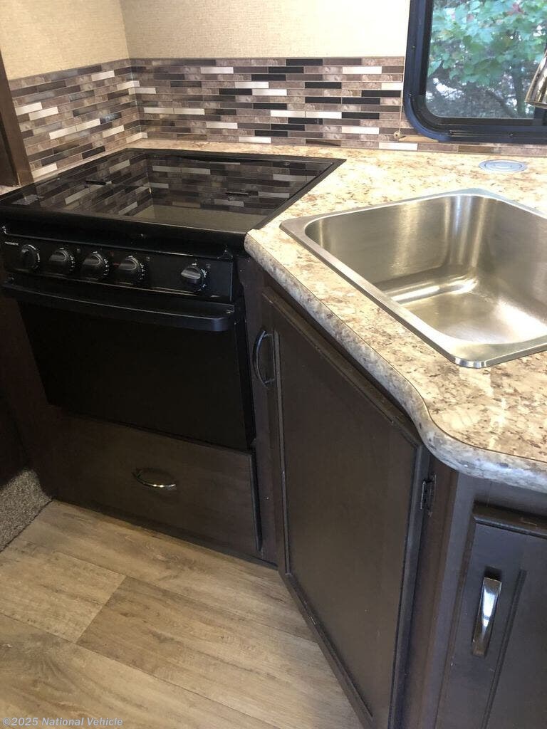 The spacious layout includes a large slide-out, a rear queen bed, an over-cab bunk, a dinette, and a sleeper sofa, comfortably sleeping up to 8. Inside, you?ll find a fully equipped kitchen with a three-burner stove, oven, microwave, refrigerator, and plenty of storage. The split bathroom design provides a roomy shower on one side and a private toilet and sink on the other for added convenience.