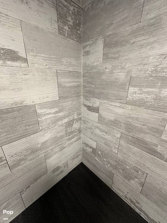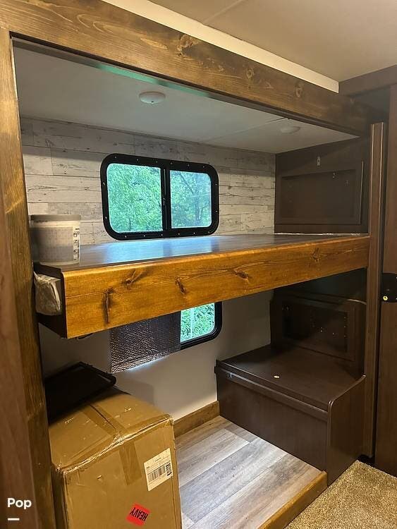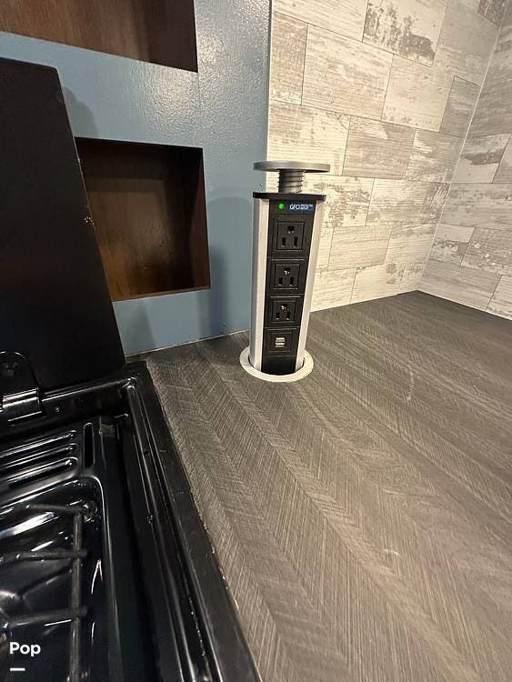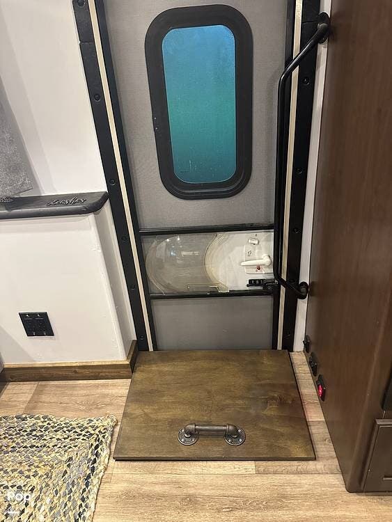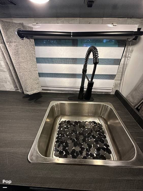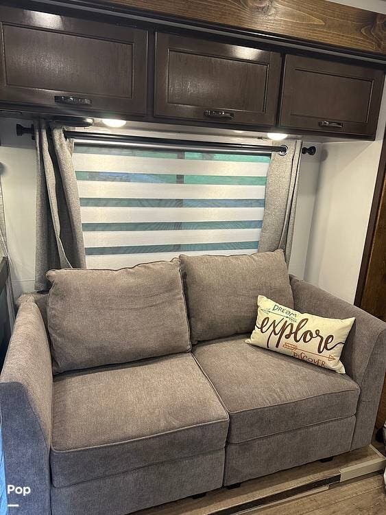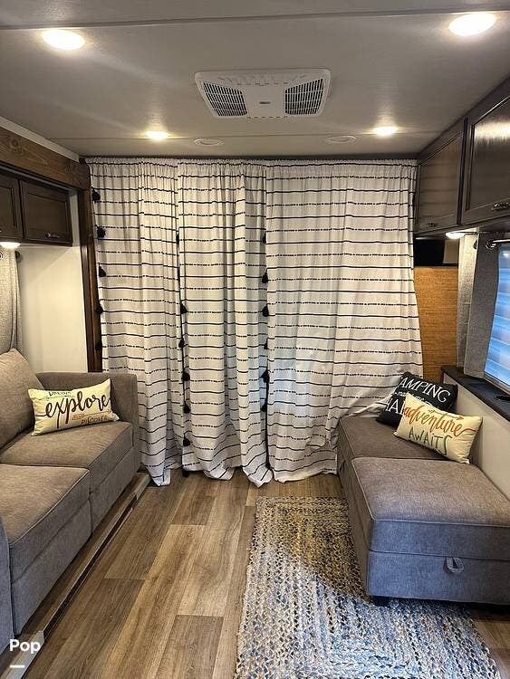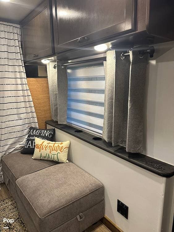 Inside, you'll find a reimagined living space designed for maximum comfort and functionality. The original dinette and couch have been replaced with a plush, modern seating area featuring a comfortable couch and matching ottomans--each with hidden storage. This transformation opens up the floor plan and makes the common area feel more like a cozy home on wheels.