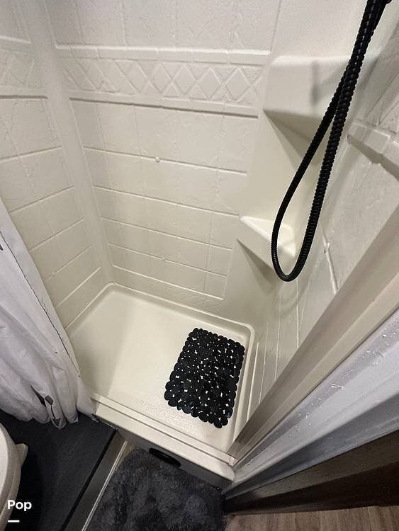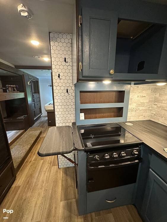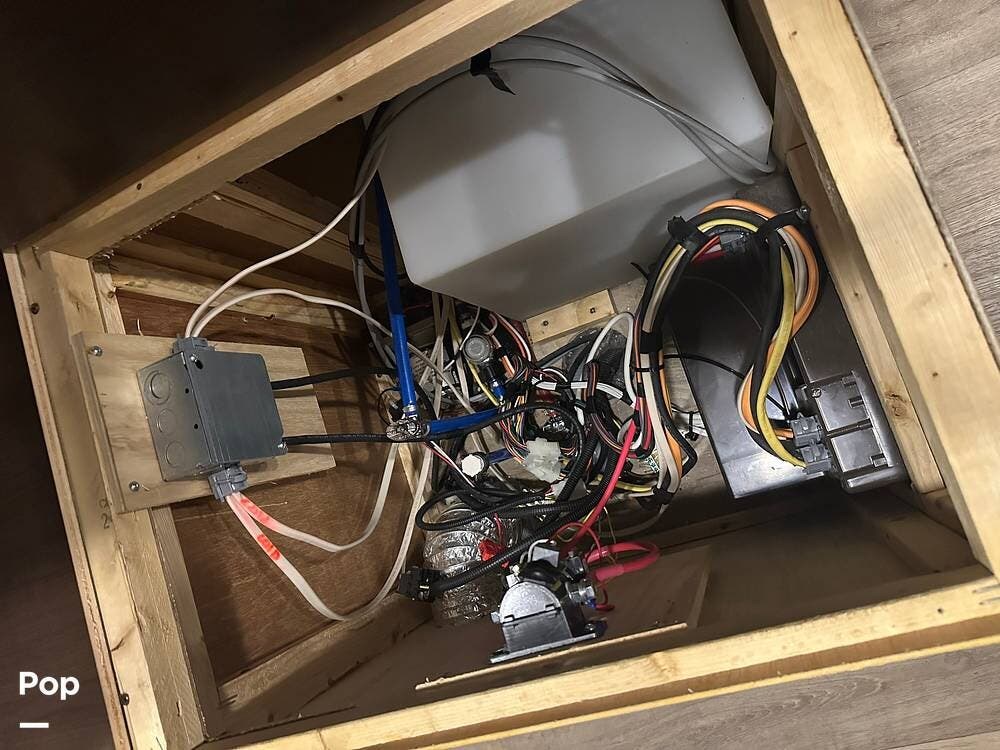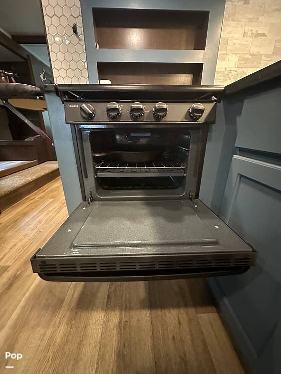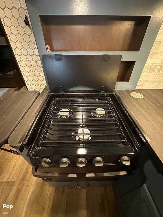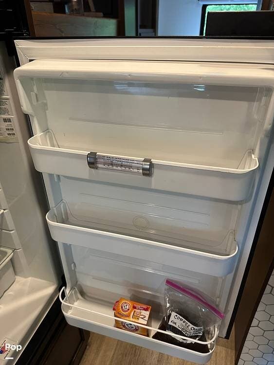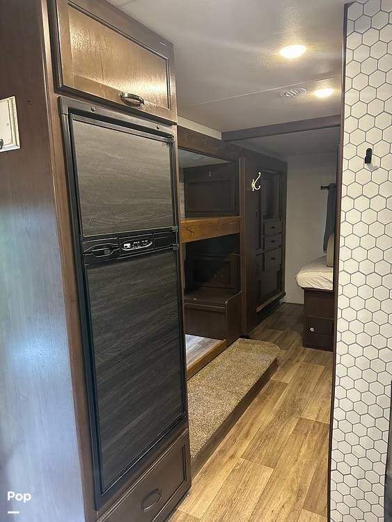 Inside, you'll find a reimagined living space designed for maximum comfort and functionality. The original dinette and couch have been replaced with a plush, modern seating area featuring a comfortable couch and matching ottomans--each with hidden storage. This transformation opens up the floor plan and makes the common area feel more like a cozy home on wheels.