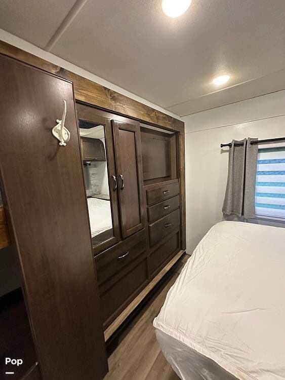 Aesthetic upgrades throughout the RV add a warm, farmhouse-style charm. The walls have been painted in soothing tones, window treatments were swapped out for zebra blinds and neutral curtains, and wooden beams and baseboards were added to enhance the overall cozy feel.