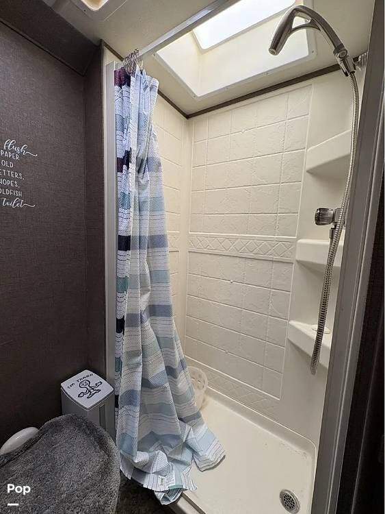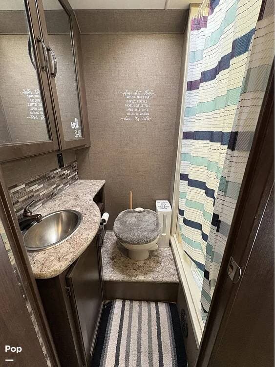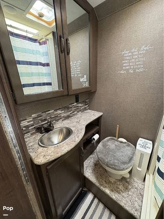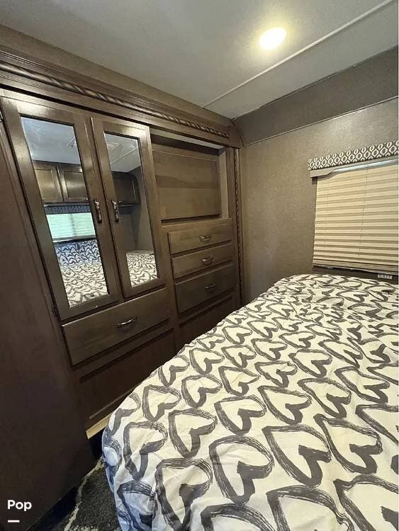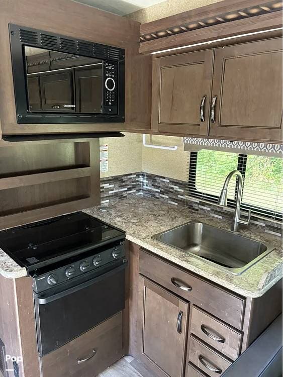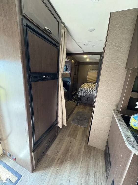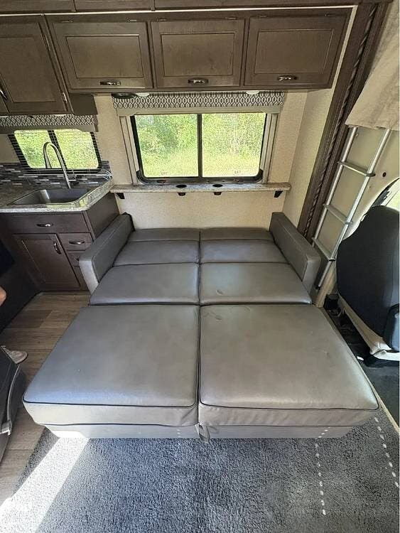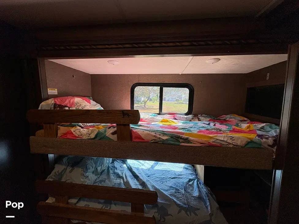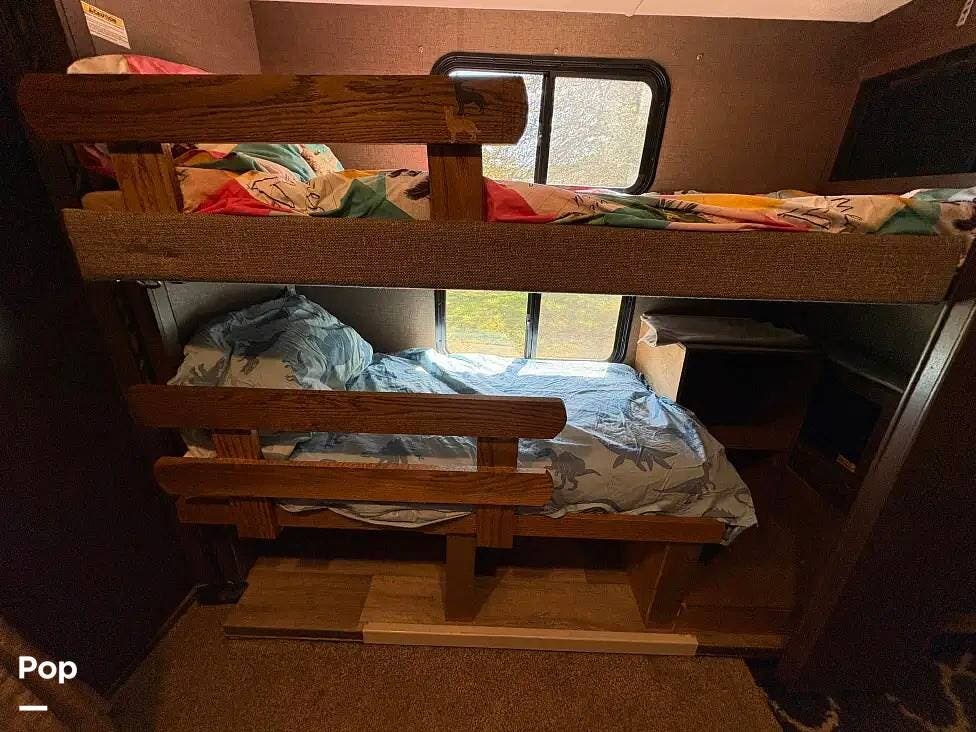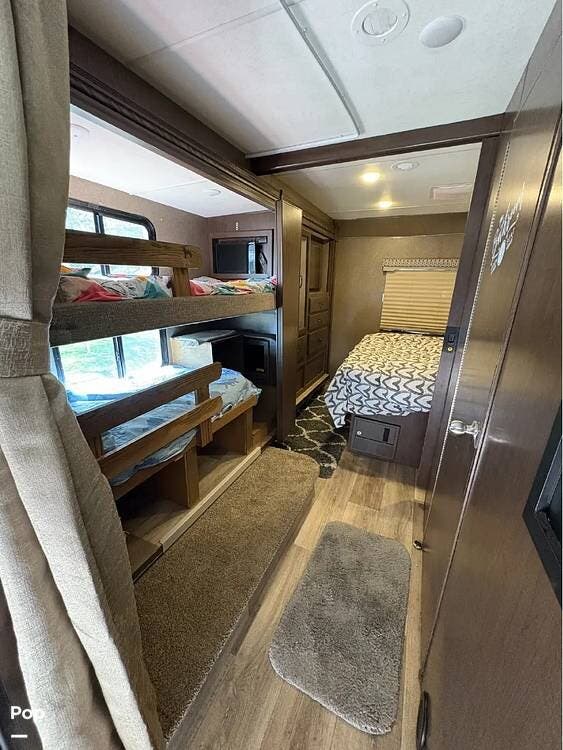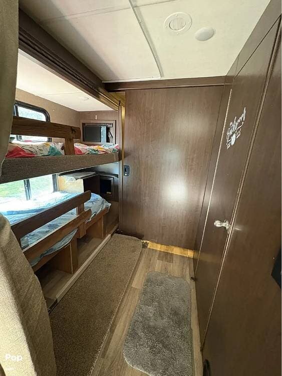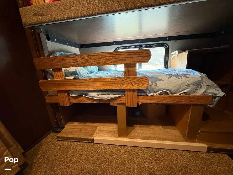 This RV features a customized layout for better fulltime living. Safer side rails installed for bunkhouse beds for your little ones, extra storage under bunks, and new larger fold out couch that has a KING size bed. The sellers also upgraded the sink faucet in kitchen, bathroom and shower!