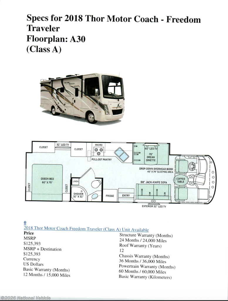 Request More Info on this 2018 Thor Motor Coach Freedom Traveler 30A Offered for sale by National Vehicle