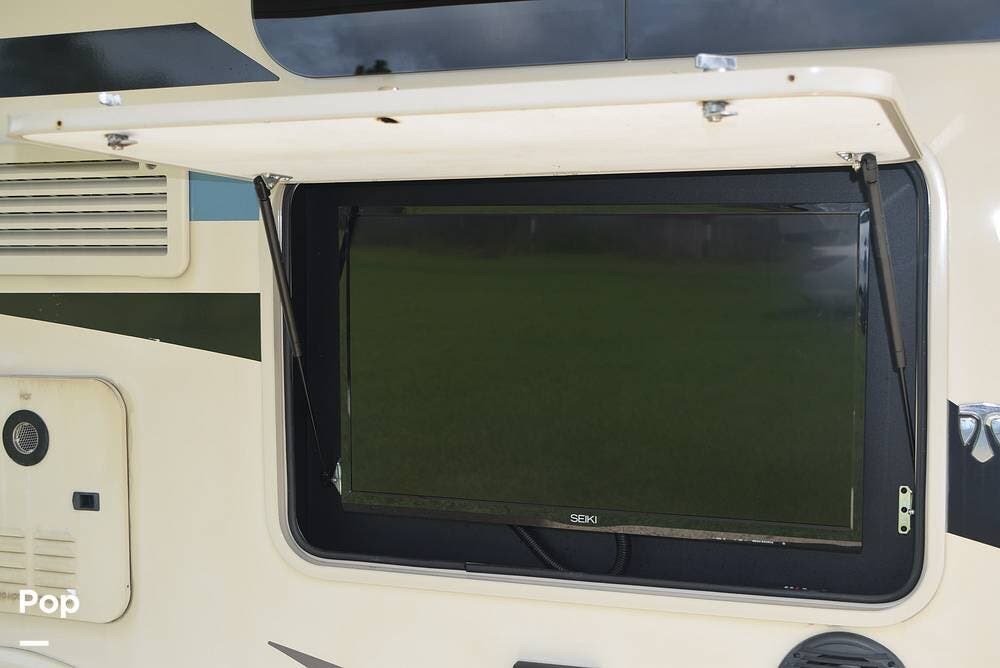 The exterior features outside entertainment with a TV, speakers, and a rear slide.