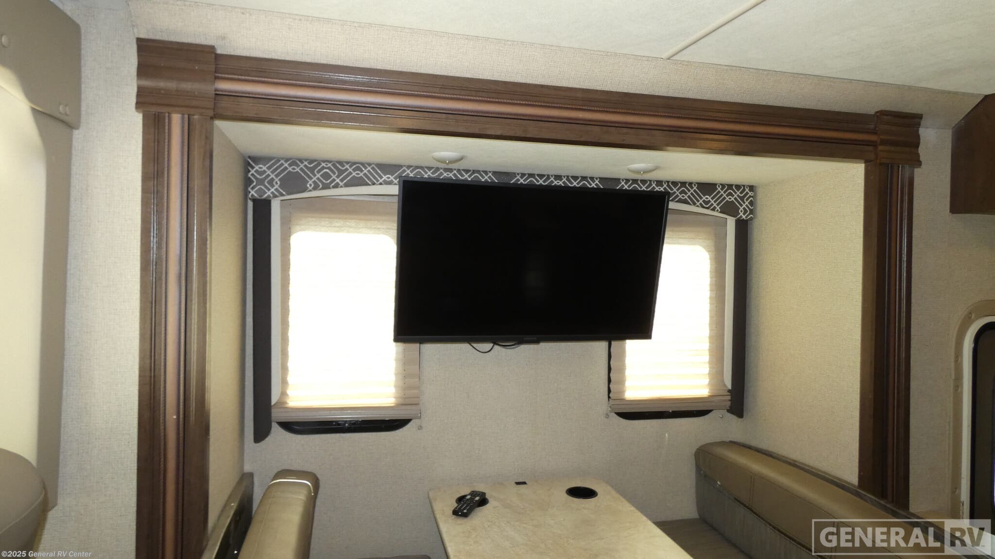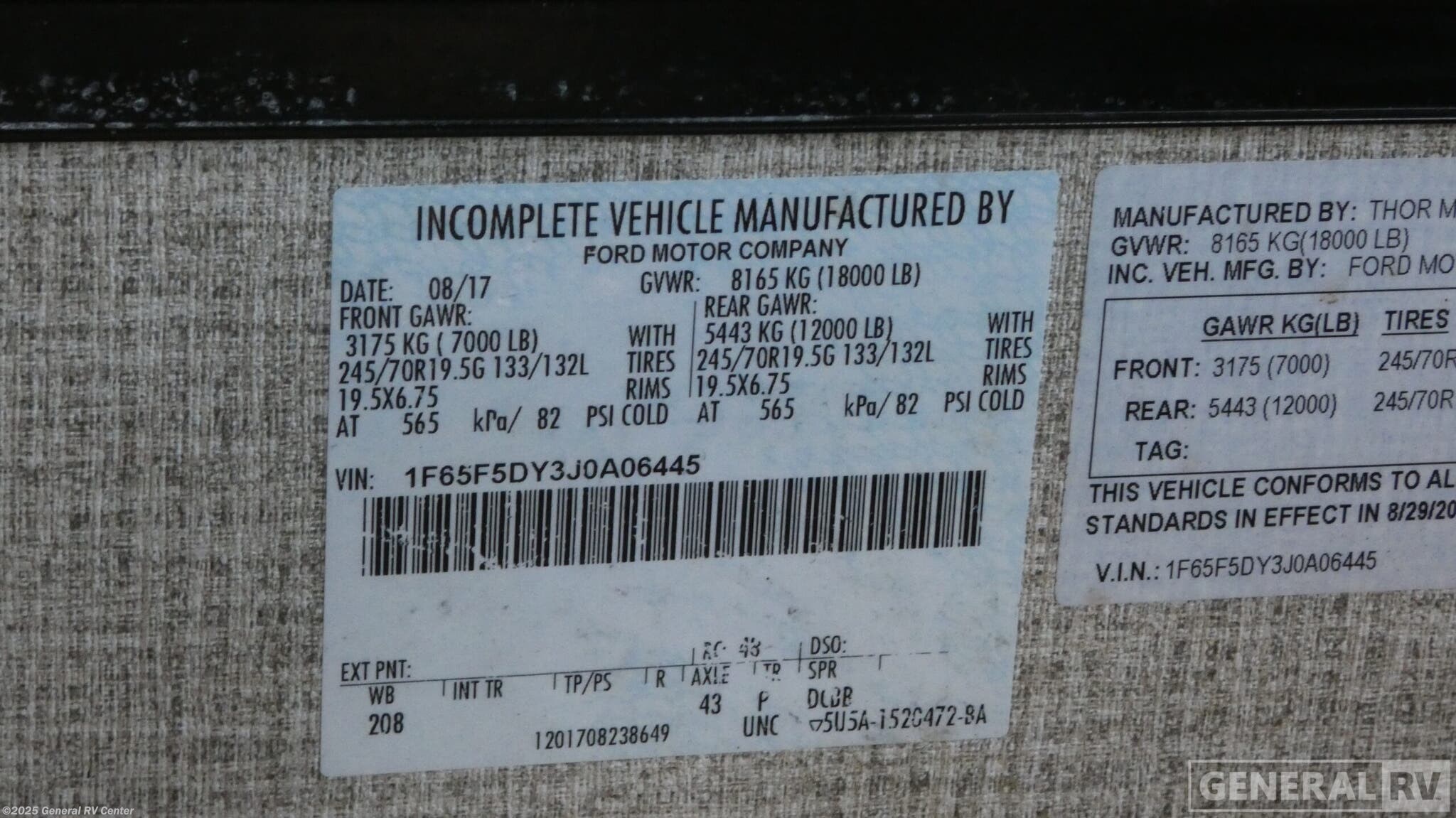Experience the open road in style with the 2018 Thor Motor Coach Hurricane 31Z. This dynamic motorhome combines comfort and functionality, making it the perfect travel companion for families and adventurers alike. With its spacious design, the Hurricane 31Z comfortably sleeps up to eight, featuring a luxurious king bed, a full-size bed, and two convertible sleeping areas. The thoughtfully designed floorplan includes a front living area with theater seats and a 70" dream dinette, perfect for relaxing or entertaining guests. The center kitchen is equipped with a three-burner cooktop and mid-size refrigerator, ensuring you can whip up your favorite meals on the go. The rear bedroom offers a serene retreat with ample wardrobe space and a 32" LED TV for those cozy nights in. The center bath is conveniently located, providing easy access from all areas of the RV. Enjoy the great outdoors under the 16.5 ft. powered retractable awning, or take in a movie on the exterior 32" LED TV. Built on a robust Ford F-Series Super Duty chassis and powered by a Triton V10 engine, this RV delivers both power and reliability. With a generous fresh water capacity of 50 gallons and a fuel tank that holds up to 80 gallons, your adventures are limited only by your imagination. For more details or to see this incredible RV in person, visit your nearest General RV dealership.
