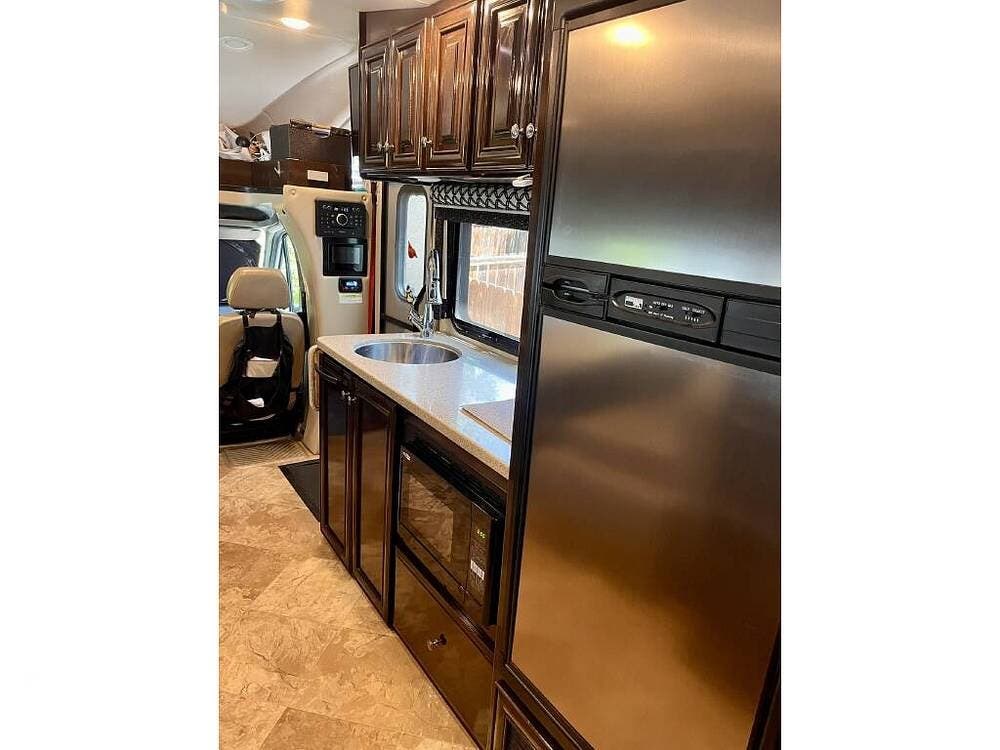 The fully equipped kitchen comes with a single induction cooktop, convection microwave, refrigerator, and solid-surface countertops, ensuring meal prep is convenient and straightforward wherever the road takes you.