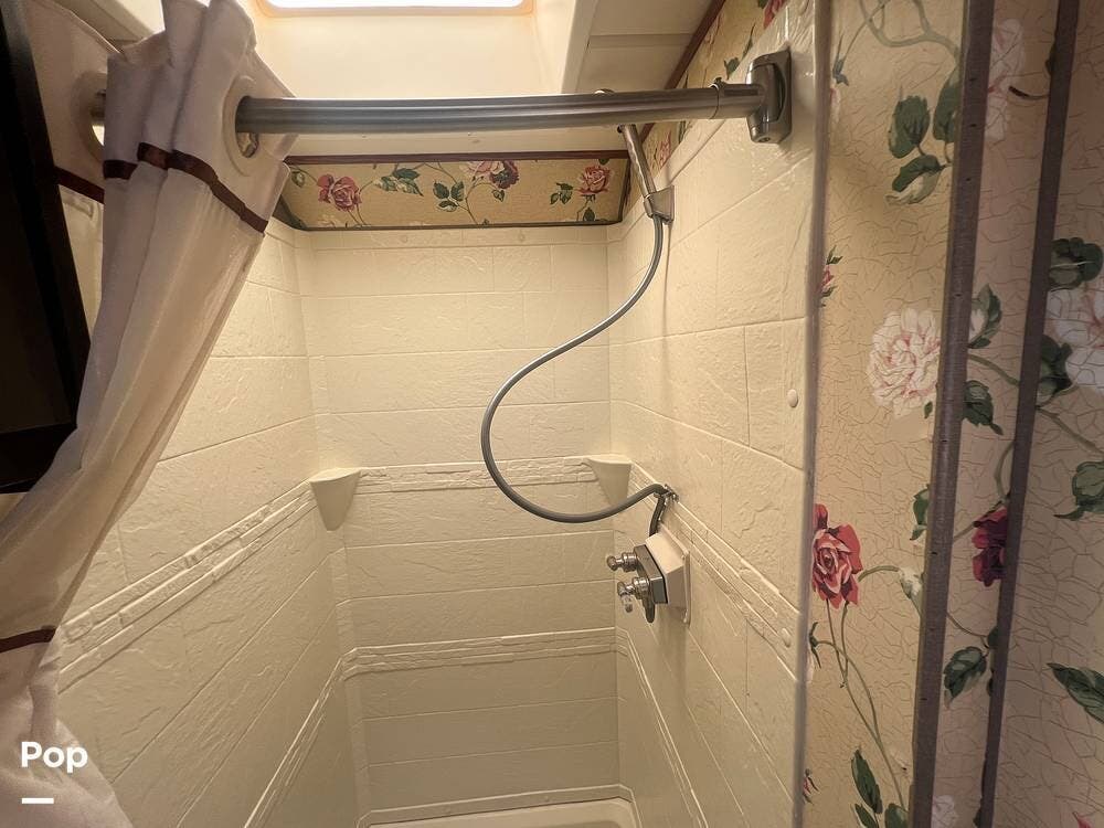 The bedroom has a TV, and a flip-down queen bed must stow the bed when traveling down the road. Fold it up and go.