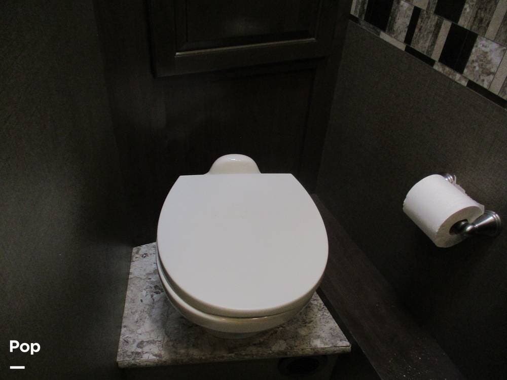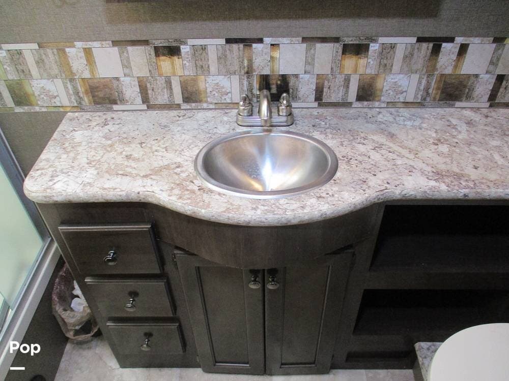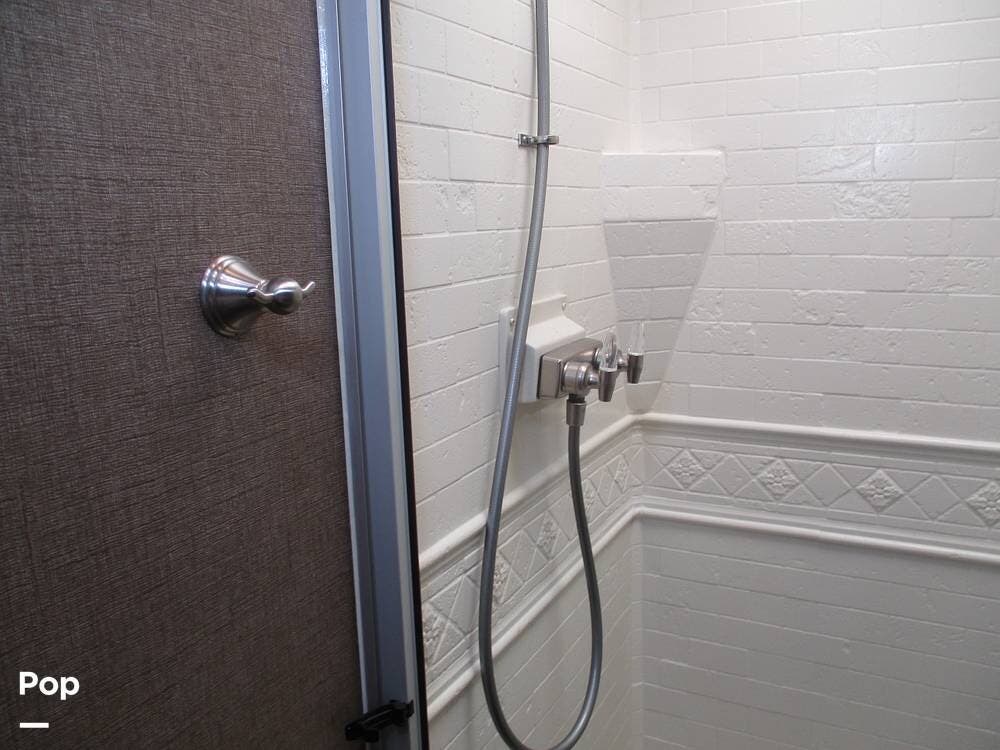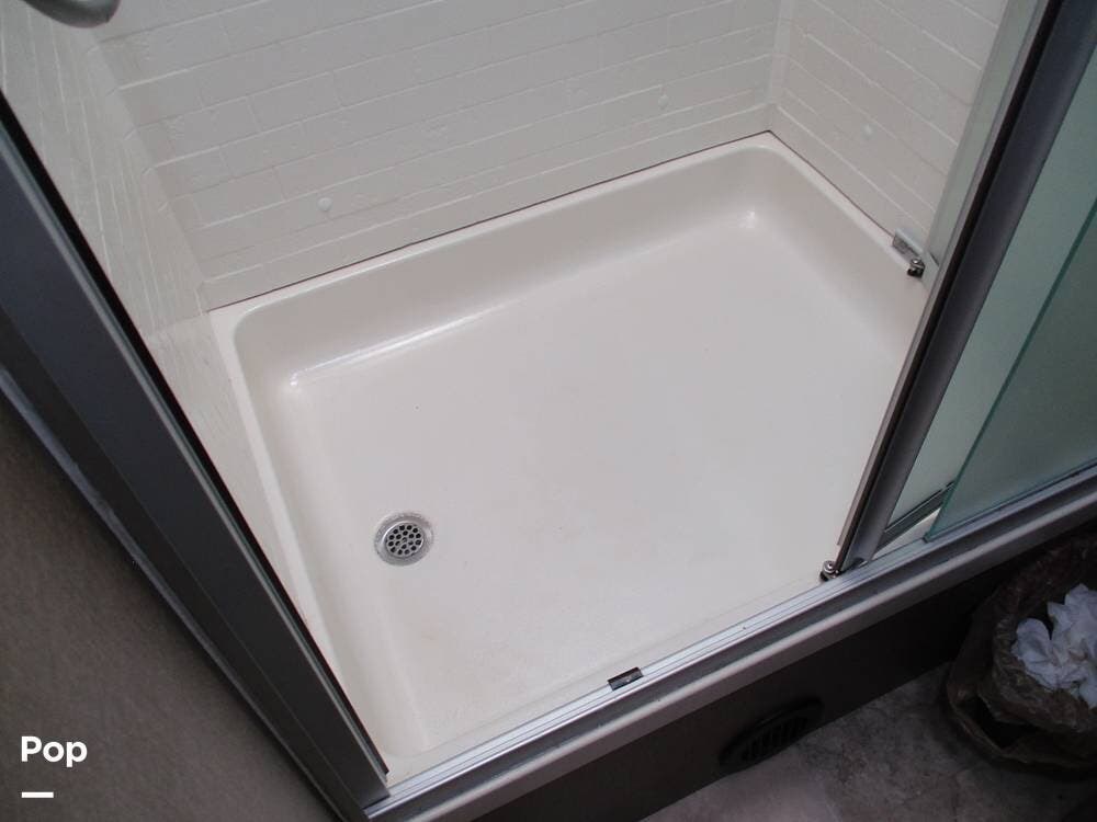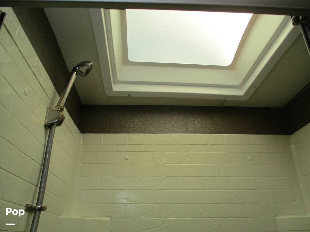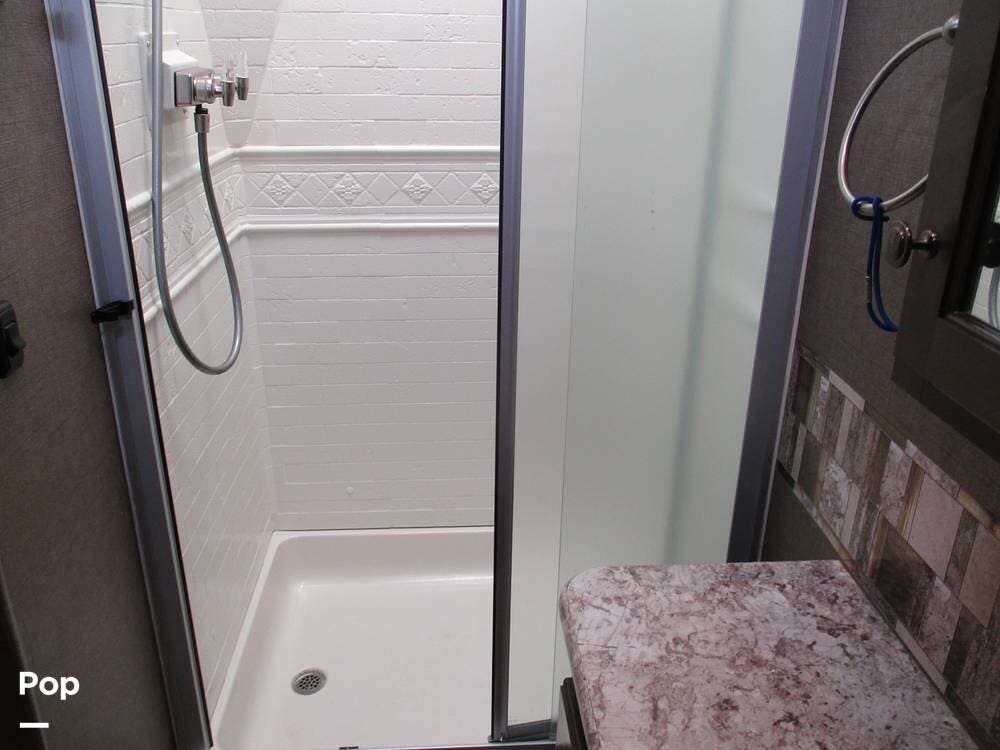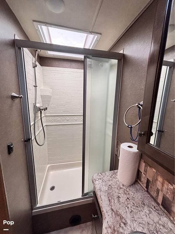 The rear bathroom features a sink with a large vanity, several storage compartments for linens and toiletries. There is also a toilet and a 36" x 30" shower.