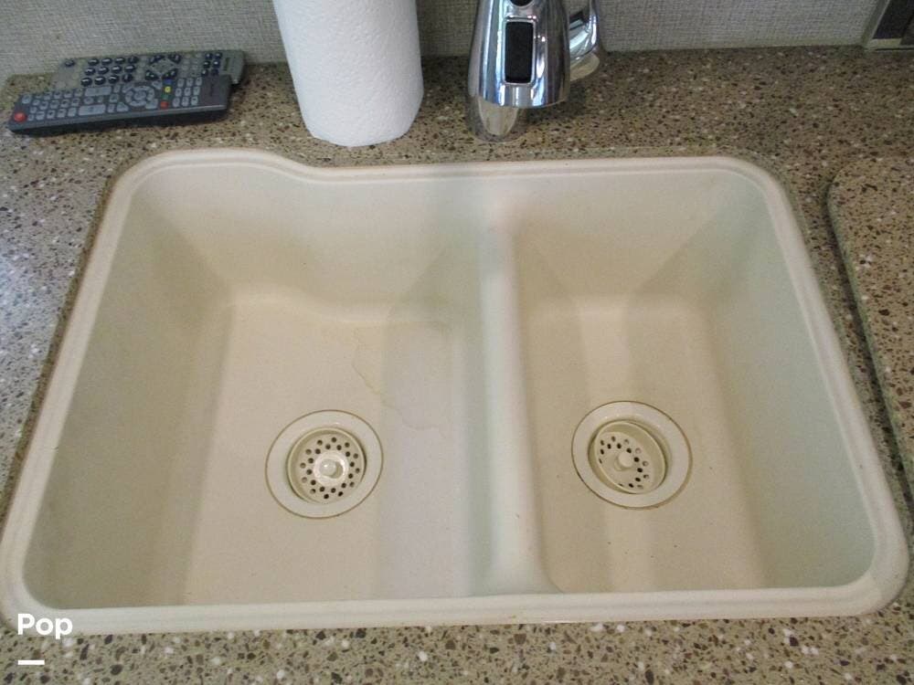 The fully equipped kitchen includes a double-bowl sink, a 3-burner stove/oven, a microwave, and a refrigerator/freezer. There is a nice cabinet for storage as well as a pantry with slide-out shelves.