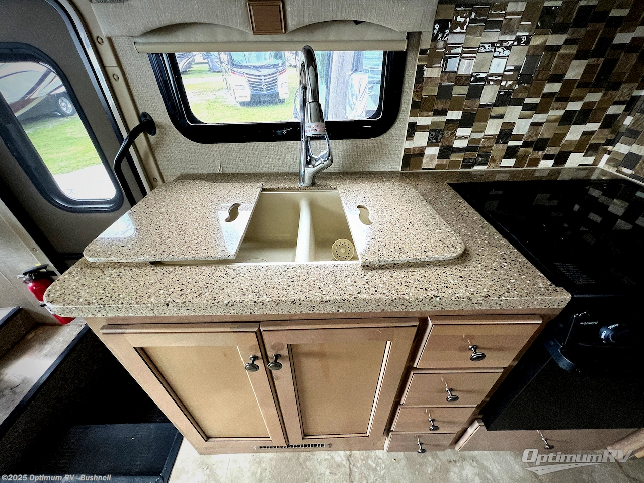You will find much to love about all Windsport models whether you are out for a long road trip across the country, or a weekend tailgating party close to home. All Windsport models feature Leatherette furniture, solid surface countertops, and raised panel upper cabinet doors with nickel finish hardware and glass inserts on select doors. You will also find added sleeping space in the drop-down cabover bunk that the kids are sure to love. With the swivel and reclining captain's chairs you can easily bring them into a conversation area in the living space once parked, and there is a dash workstation with 110-volt and 12-volt outlets at the passenger side for those who need to do a bit of work while traveling, or for those who just enjoy surfing the internet. On the outside, enjoy Robocast storage compartments, an outdoor shower, plus a 32" LED TV on a manual swivel, and a legless lateral power awning with integrated LED lighting. Make any Windsport class A gas motor home by Thor Motor Coach your new home-away-from-home today!