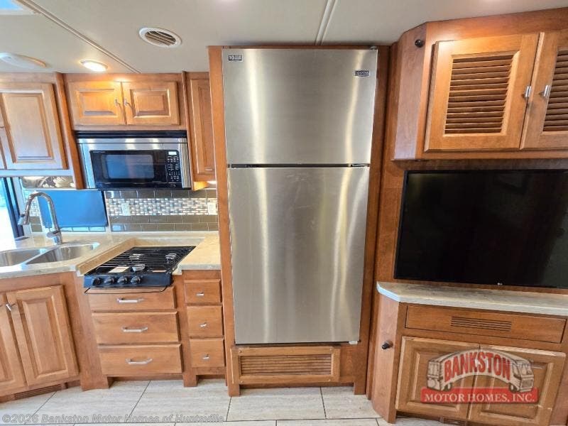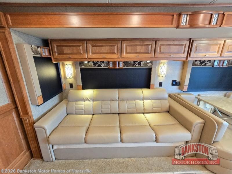 On the right side find a slide out booth dinette and sofa bed with overhead cabinet. You can even choose to have an optional dinette with a computer station and an L-shaped chaise sofa bed with coffee table. A standard TV is mounted along the outer bathroom wall for perfect viewing from any seating in the room, also you can add an optional fireplace for those chilly evenings!