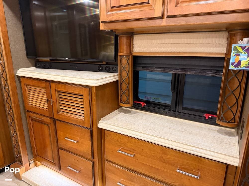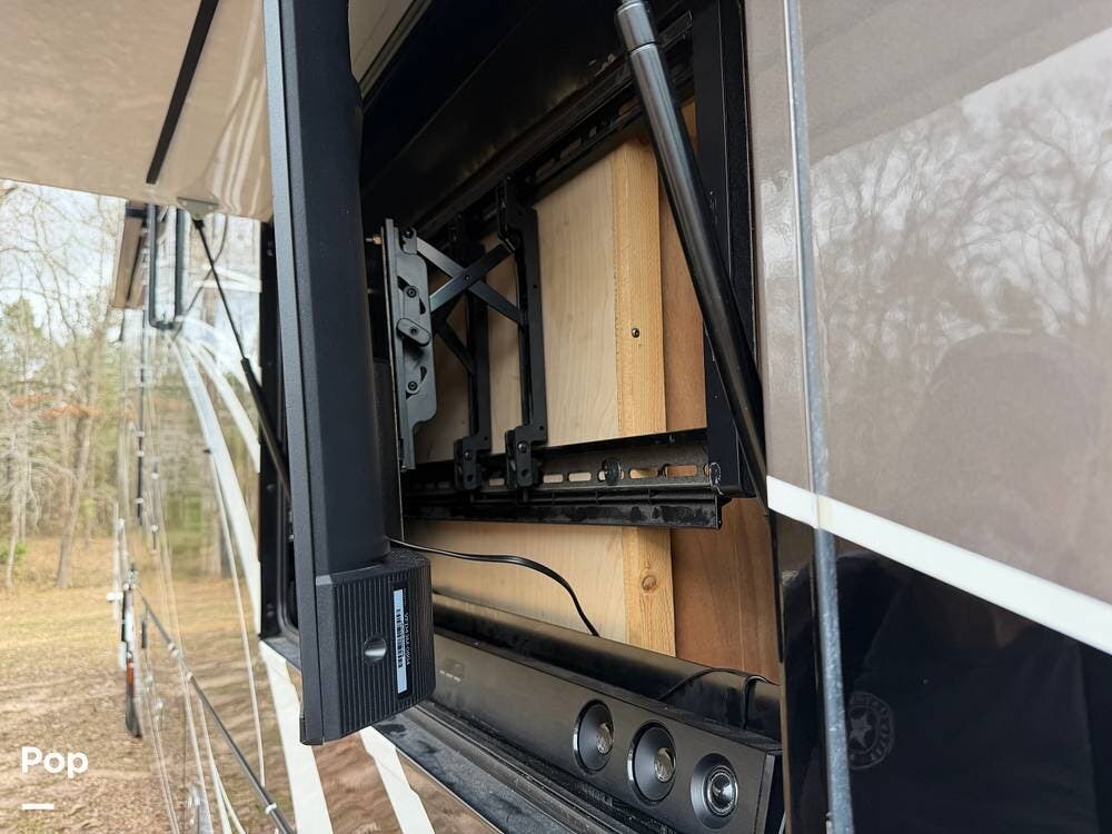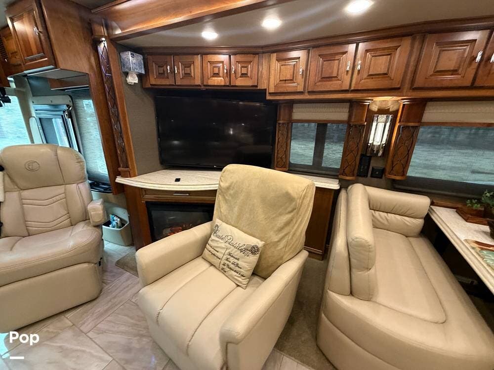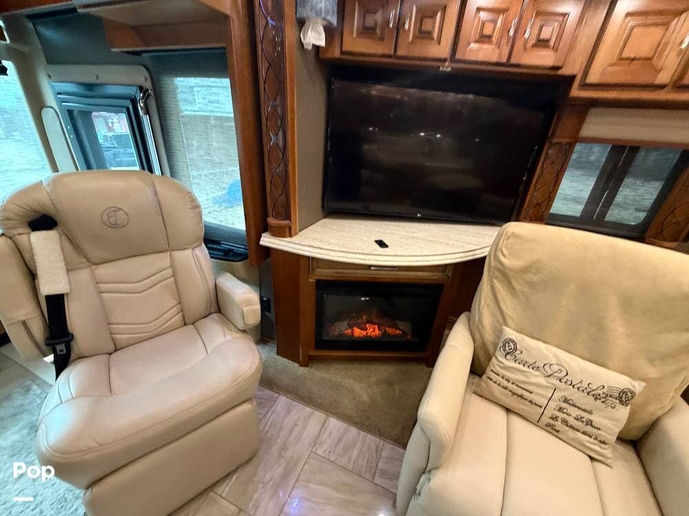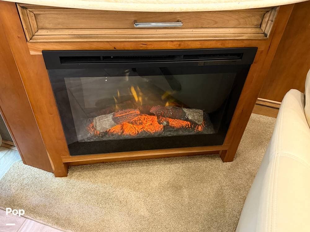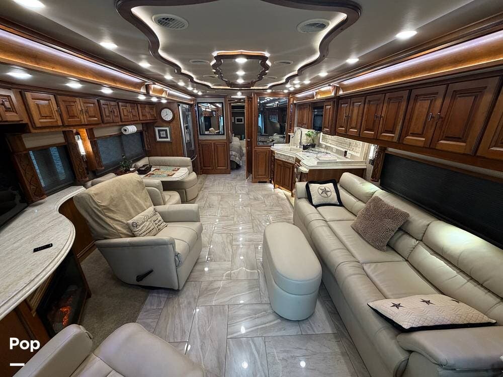 Inside, you'll find premium hardwood cabinetry, polished tile floors, solid-surface countertops, and refined finishes throughout. The spacious 4-slide floor plan creates a true residential feel, with a large living area, plush seating, a fireplace, and a big-screen TV--perfect for relaxing or entertaining.