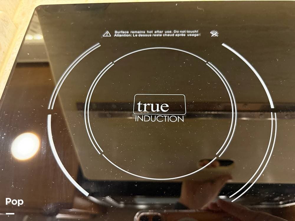 The gourmet kitchen features a residential refrigerator, induction cooktop, convection microwave, and ample pantry space. The master suite offers a king bed, generous wardrobe space, and a stacked washer/dryer for convenience during extended travel. The bath-and-a-half layout adds extra comfort for guests.