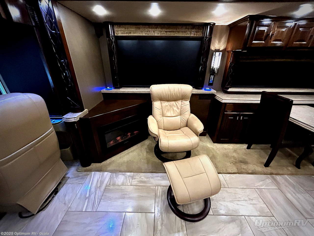 This Tiffin Allegro Bus class A diesel coach model 45 OP allows you to enjoy your life away from home with the comforts of home. Starting with the 3 interior TVs, the Ultra Leather air coil sofa, and the Ultra Leather DE Sofa with TV cabinet and fireplace you can relax, watch the big game, or visit with family and friends just like at home. However, if you need to get some work done the dinette is also a work station with two chairs. The stainless steel residential refrigerator allows you enough space to take plenty of cold items with you to make your favorite meals on the polished solid surface countertops. You also have a large full bath with dualsinks including a closet for your wardrobe needs, and a half bath. There is even a wall safe in the bedroom as an added security measure, an exterior TV, plus more! This model is also available with a Freightliner chassis.