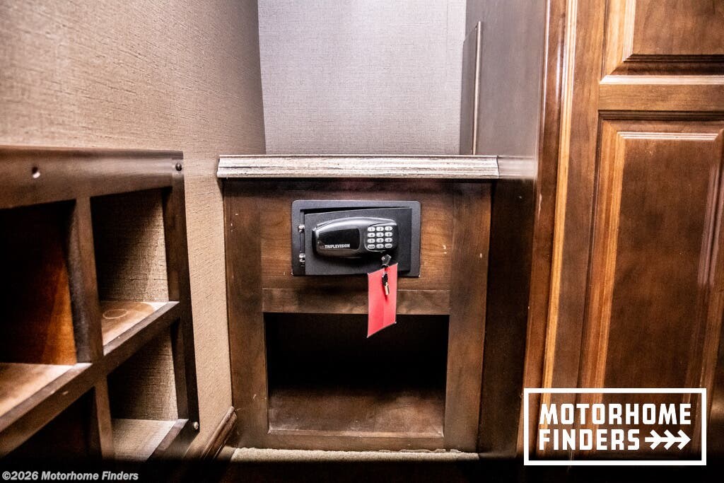 Large rear wardrobe with stacked washer and dryer and a security safe – true residential functionality and peace of mind.