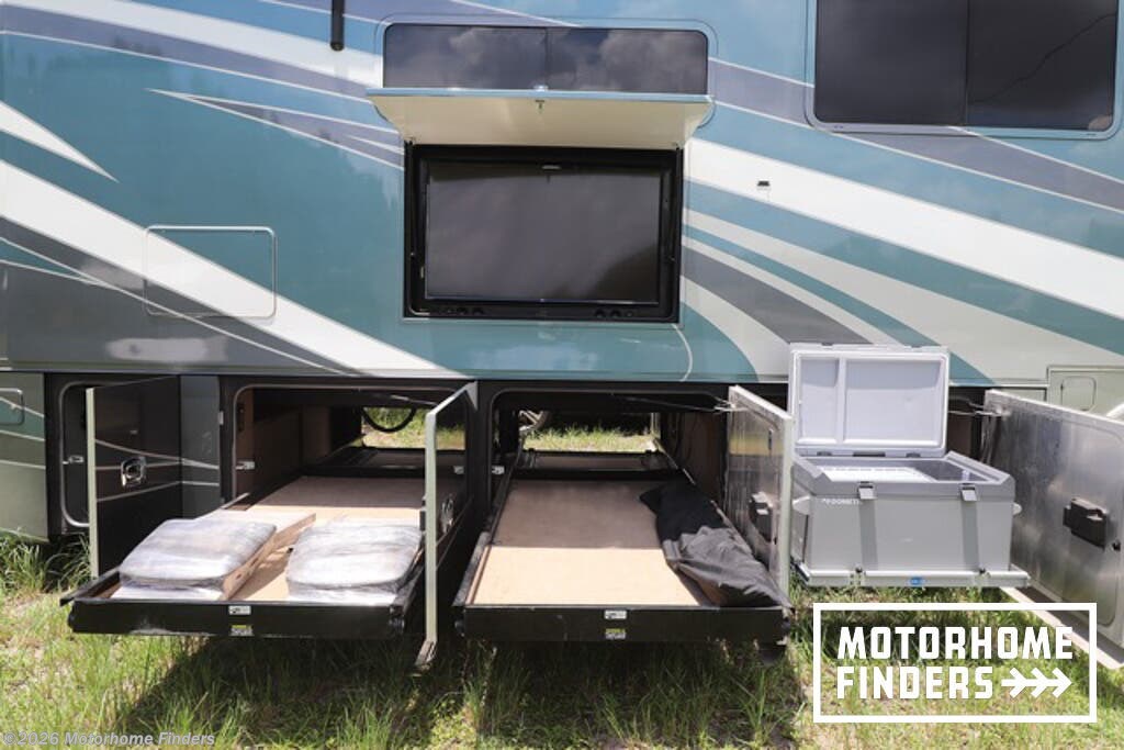 Air Assist Suspension, Alloy Wheels, Automatic Leveling Jacks, Awning, Backup Monitor, Black Tank Flush, External Shower, Full Body Paint, Hitch, Keyless Entry, Leveling Jacks, Outside Entertainment Center, Pass Thru Storage, Power Awning, Power Roof Vent, Screen Door, Side View Cameras, Skylight, Slideout, Slide-out Awning -