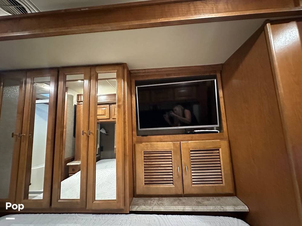 In the back, the master bedroom features a king bed, a large wardrobe, and an additional TV. The coach also features one and a half baths, with the main one located in the rear, complete with a spacious shower, sink, and storage.