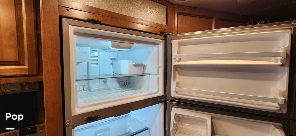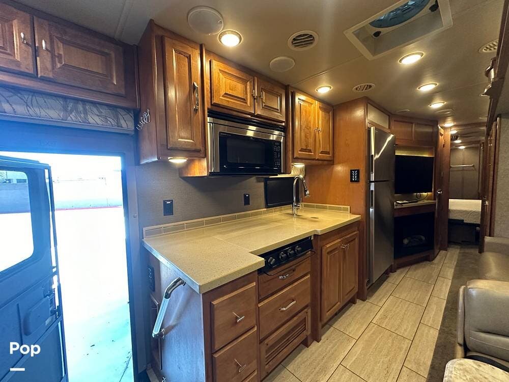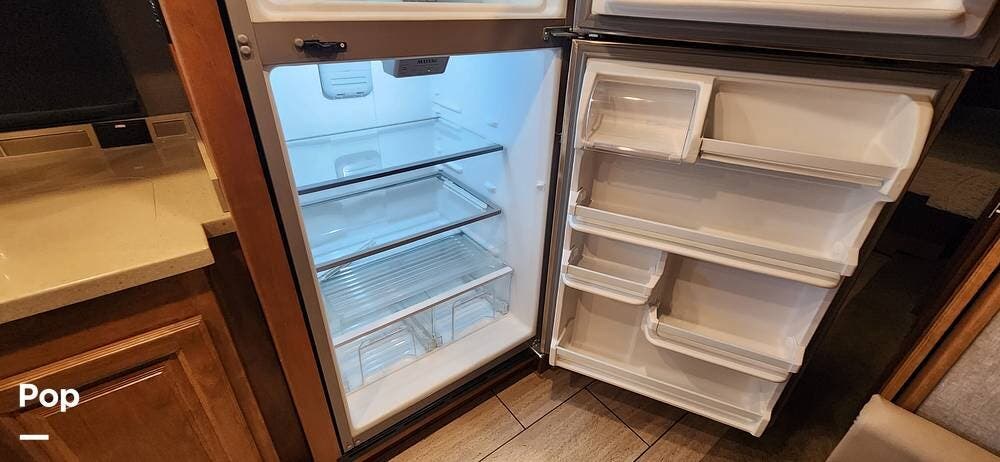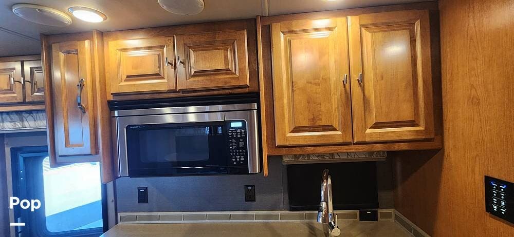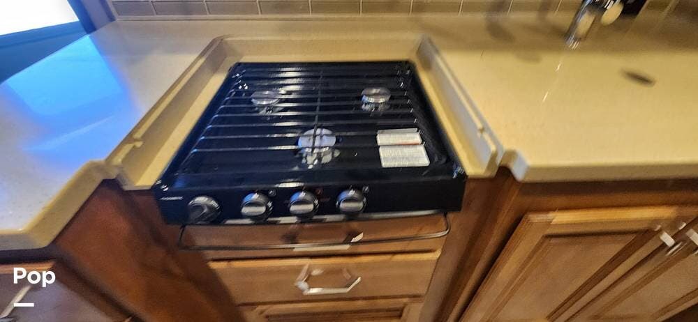 The kitchen is equipped with solid surface counters, a three-burner cooktop, a convection microwave, a residential-style refrigerator, and ample storage. There's even a pull-out pantry and plenty of overhead cabinets to stash things.