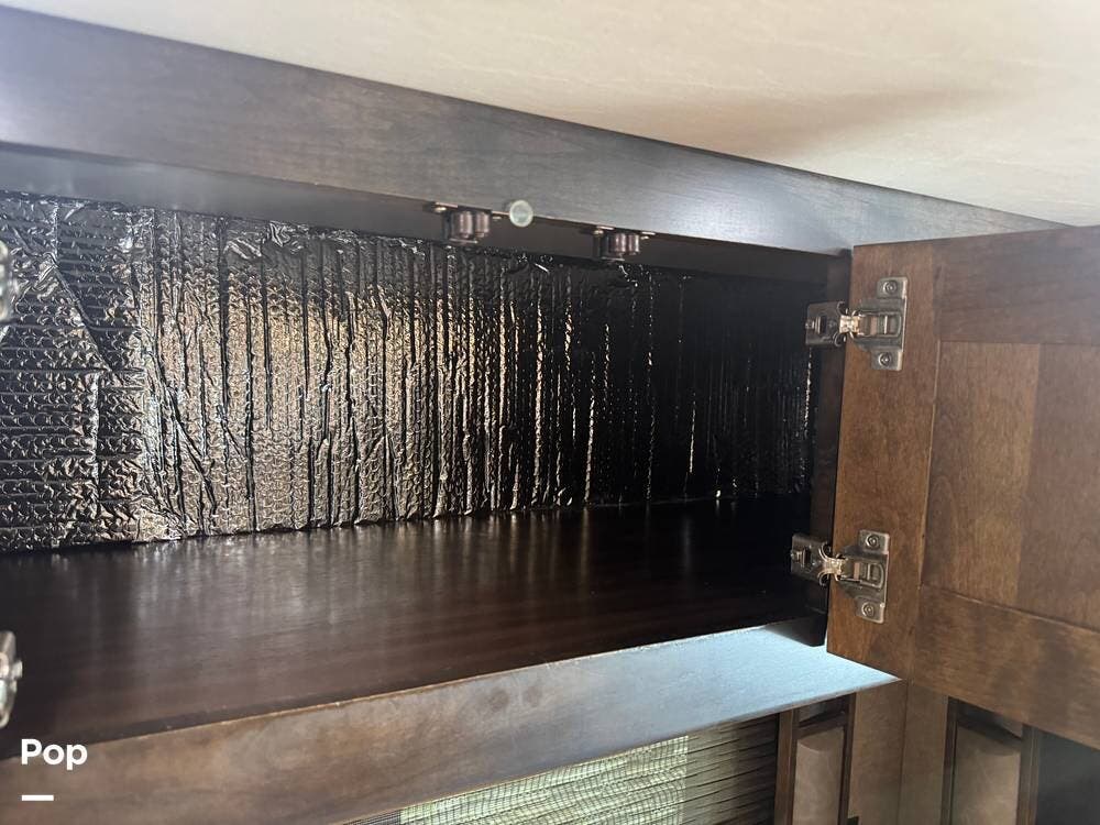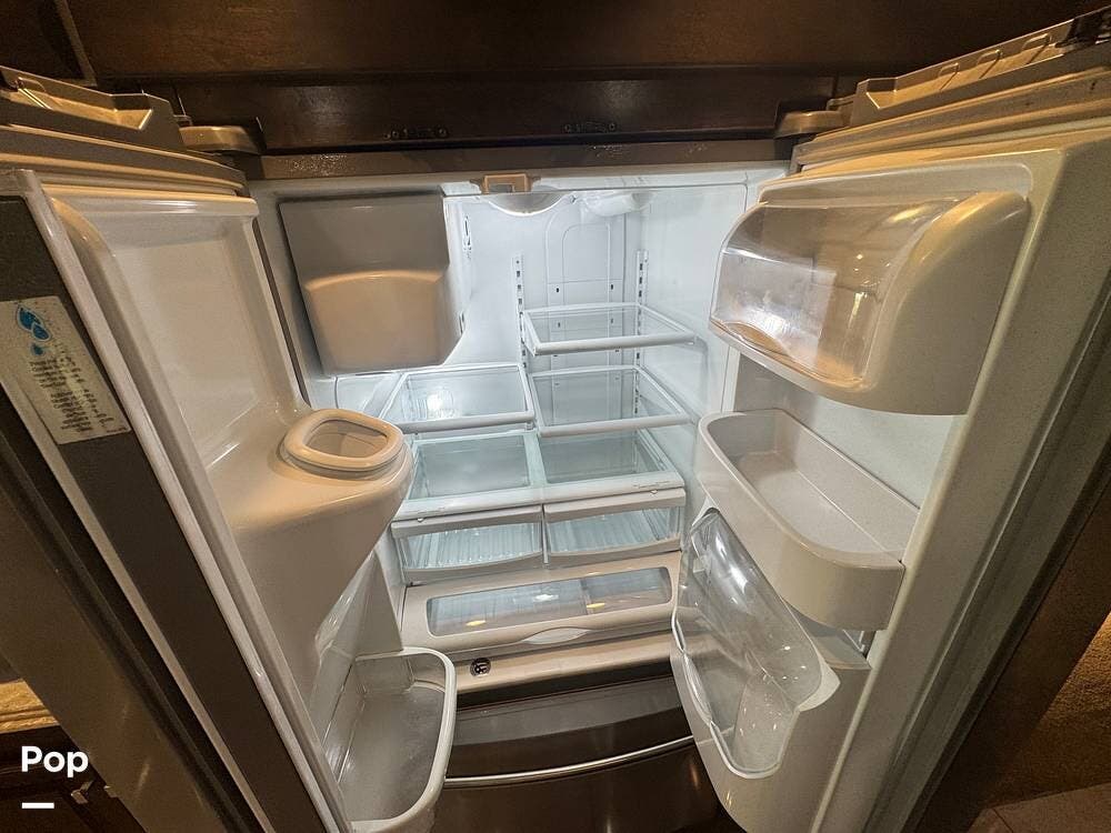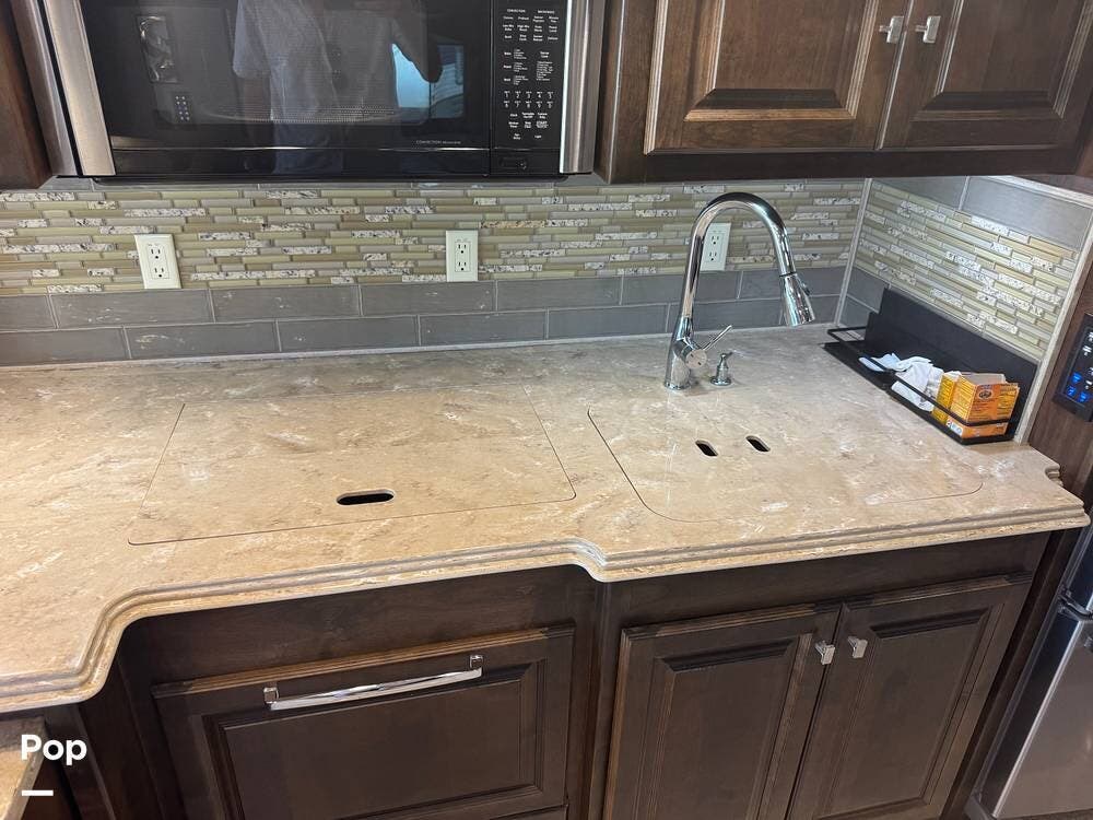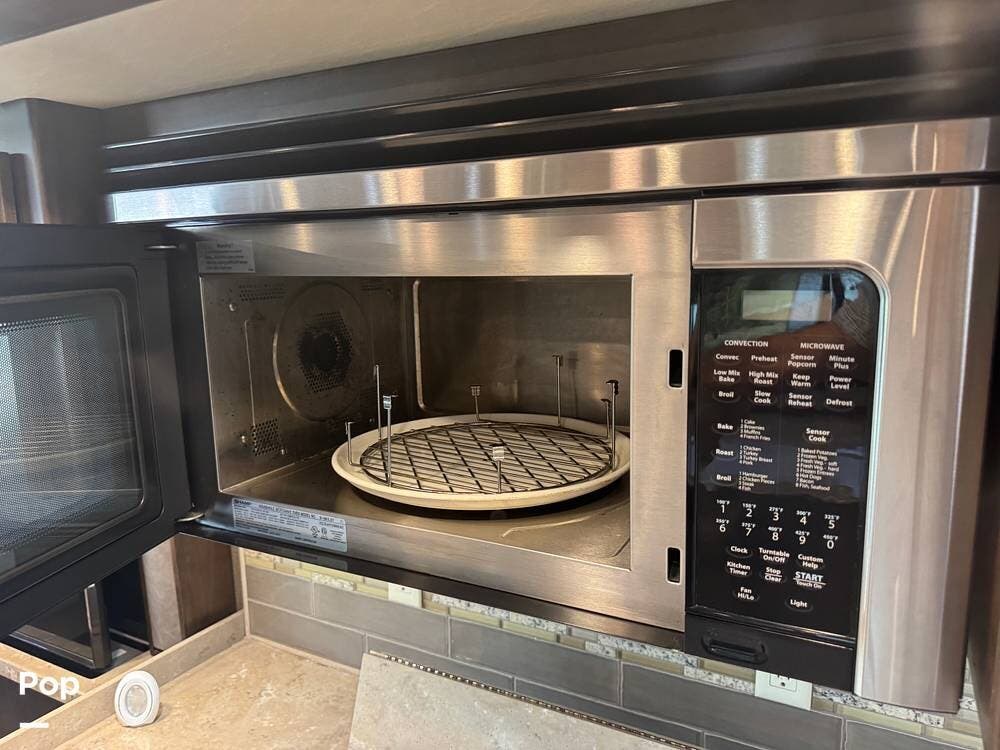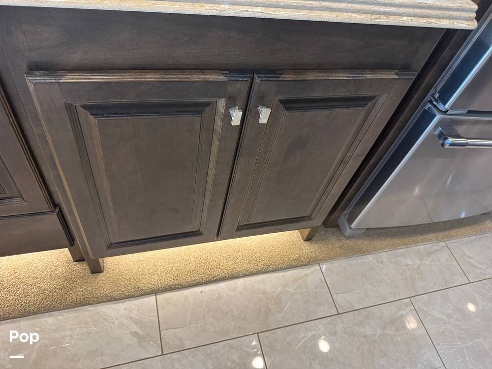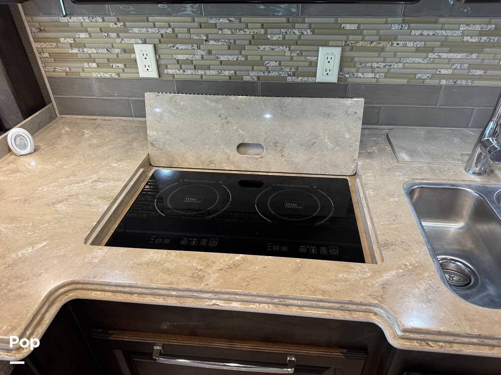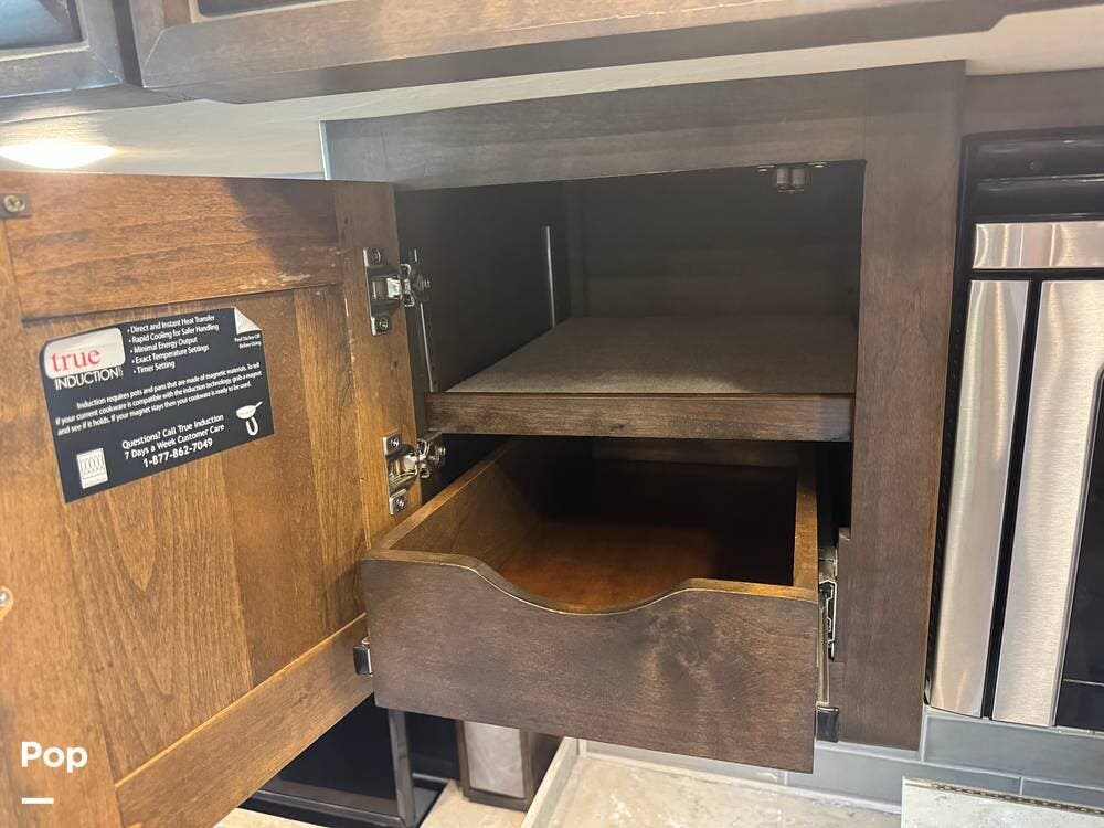 The fully equipped kitchen features solid-surface countertops, stainless steel appliances, ample storage, and a residential-style refrigerator -- ideal for extended trips or full-time living. It also features an induction stovetop, double kitchen sink, convection microwave and lots of counter space, including an arm of countertop that extends and retracts as needed.