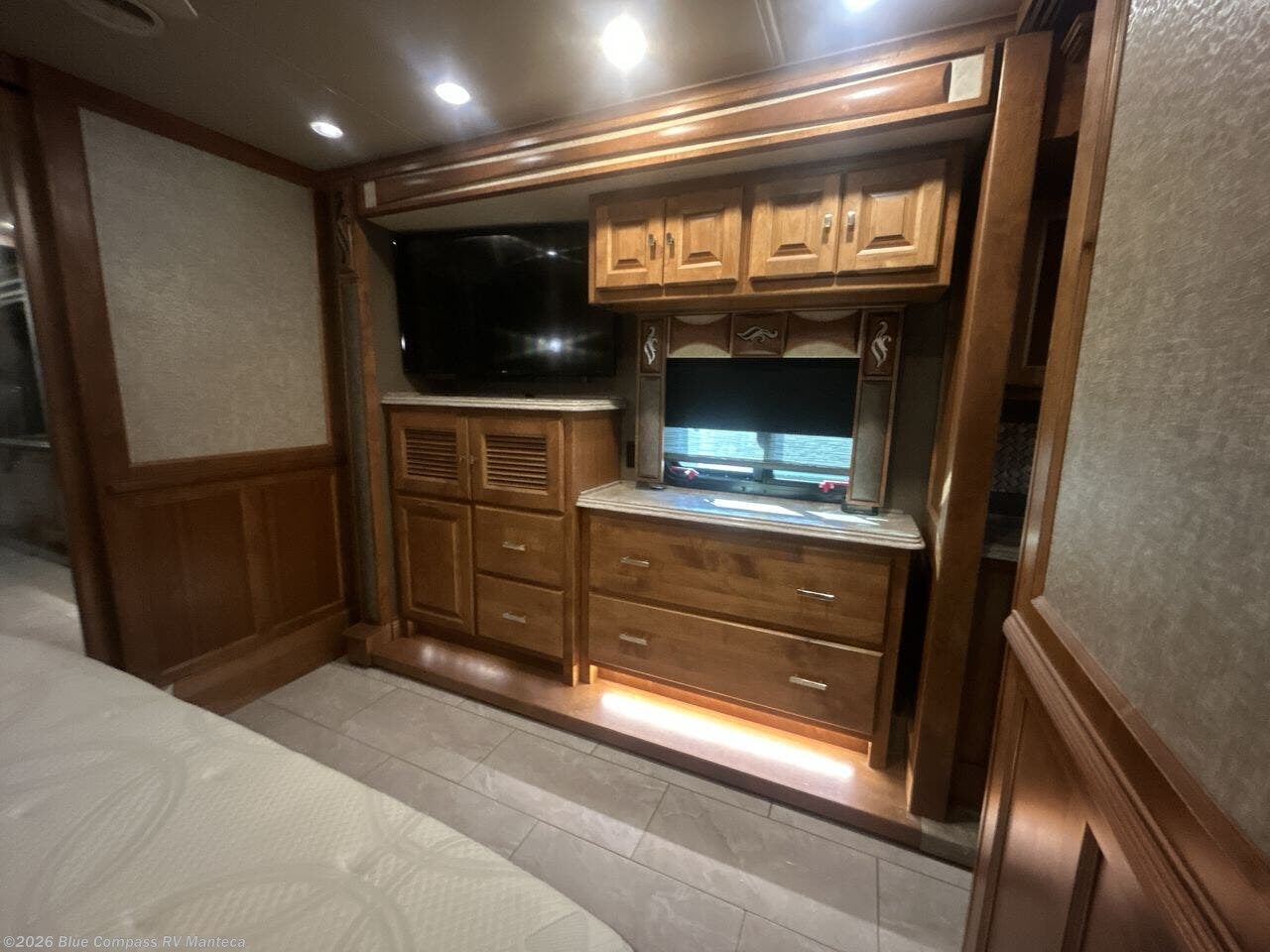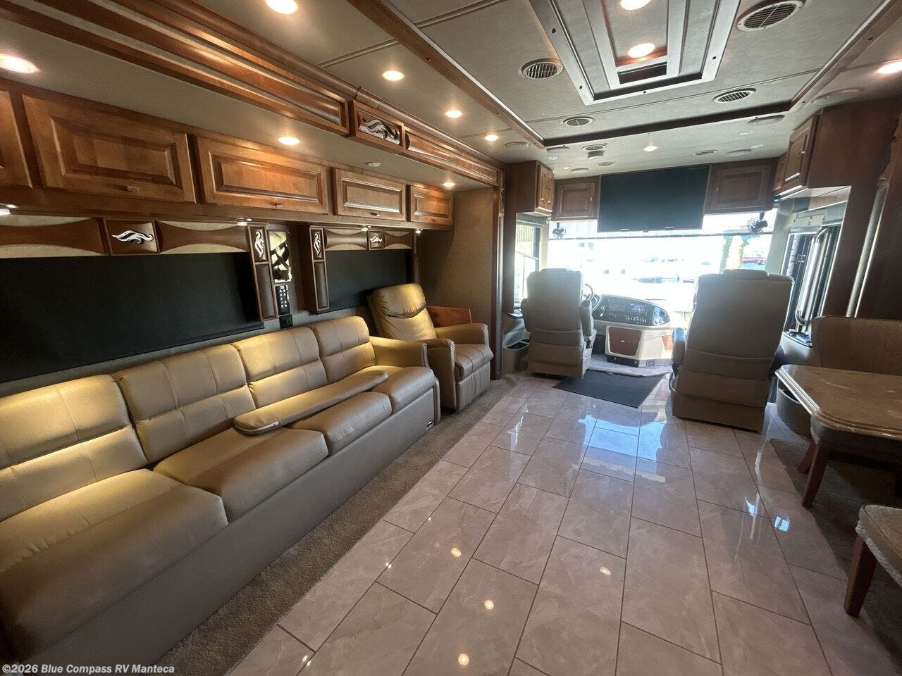 The front cab area has lots of overhead cabinets and a TV.