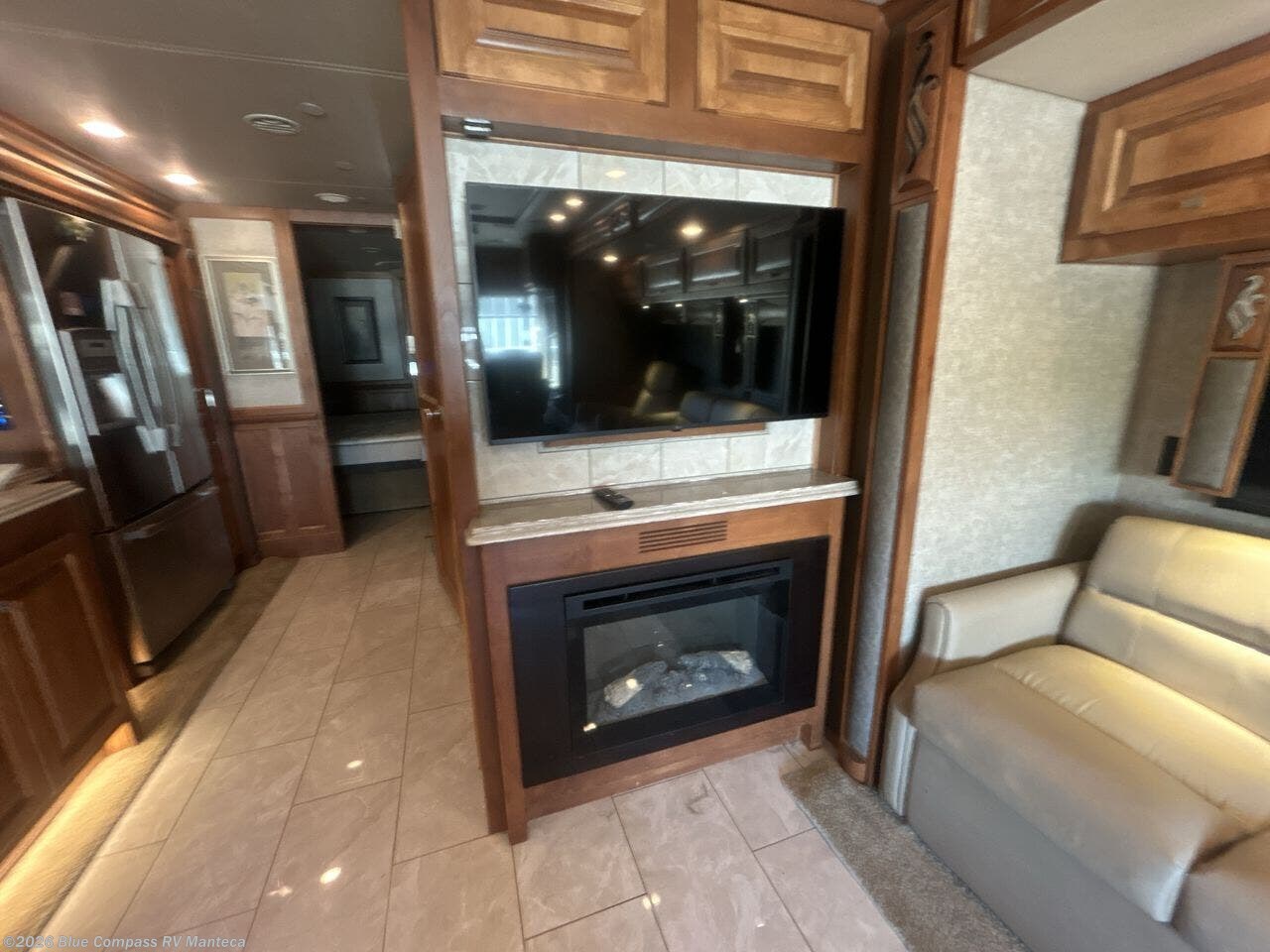 A large roadside slide has a chair and sofa bed, or you can choose an optional L-shaped chaise sofa bed and a leather recliner. Adjacent to the slide out along the interior wall there is a TV and an optional fireplace.