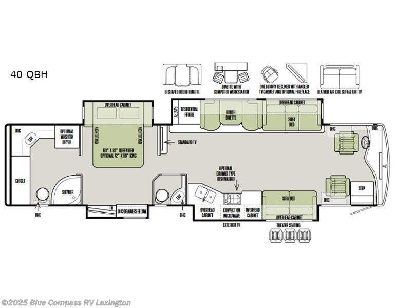 Moving down the roadside, the slide out has a sofa bed, booth dinette, overhead cabinets, residential refrigerator, and a pantry. You may also choose the following optional items for the slide out, a u-shaped booth dinette, a dinette with computer workstation, a luxury recliner with angled TV cabinet and optional fireplace, or an exterior sofa with lift TV. Just back inside the coach along the interior wall there is a TV facing the front.