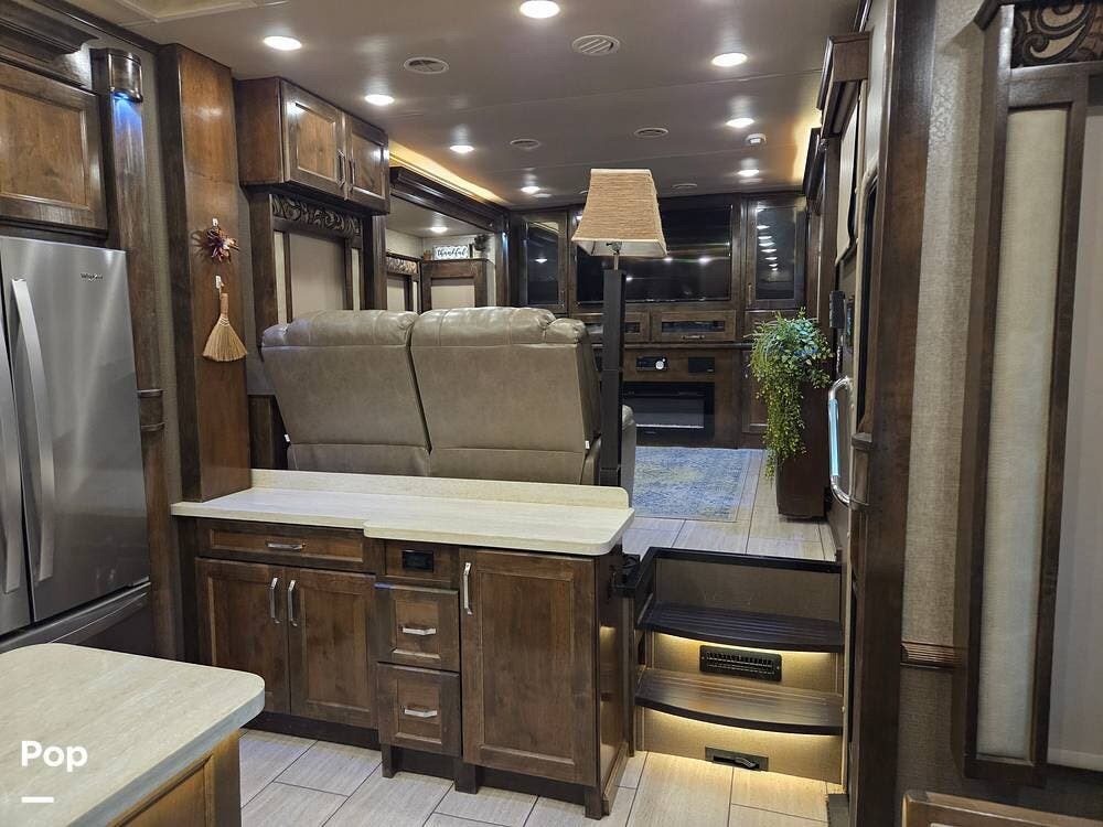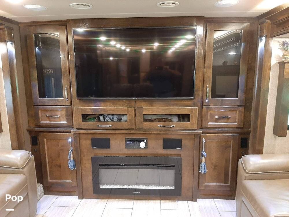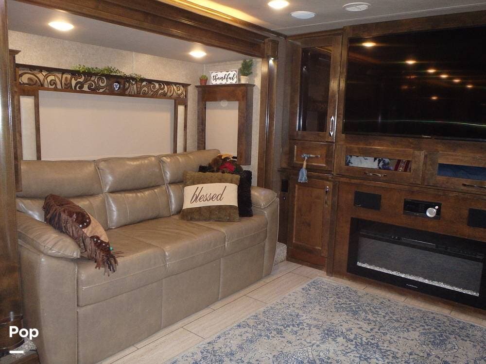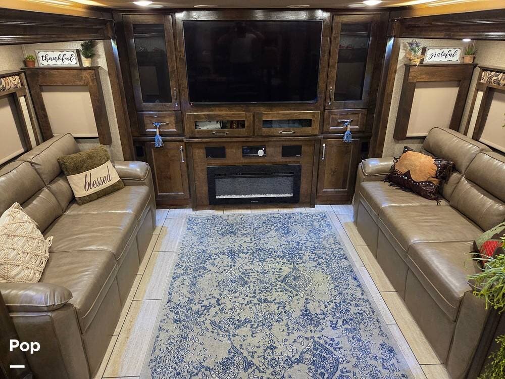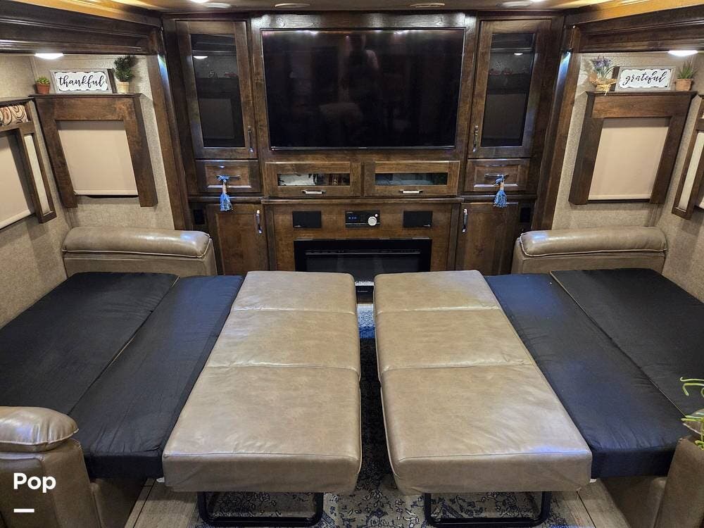 The front living area includes opposing tri-fold sofas that can convert into beds, as well as power theater seating facing a large entertainment center with a fireplace and large TV. Hardwood cabinetry, recessed LED lighting, and high-end furnishings add to the residential feel.
