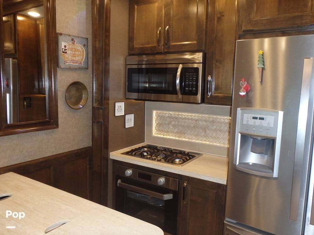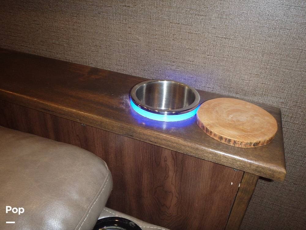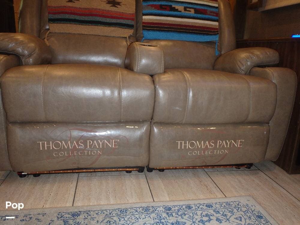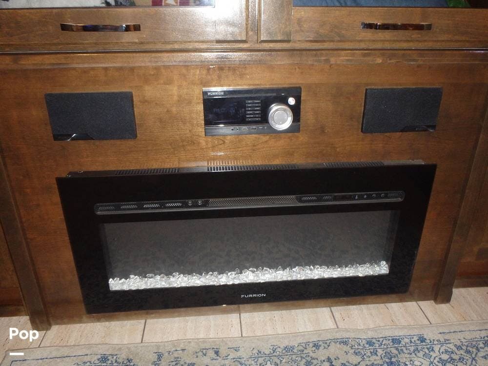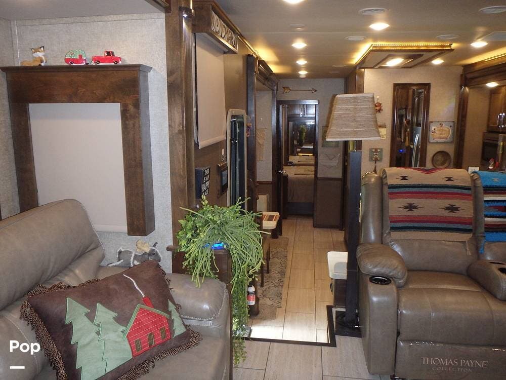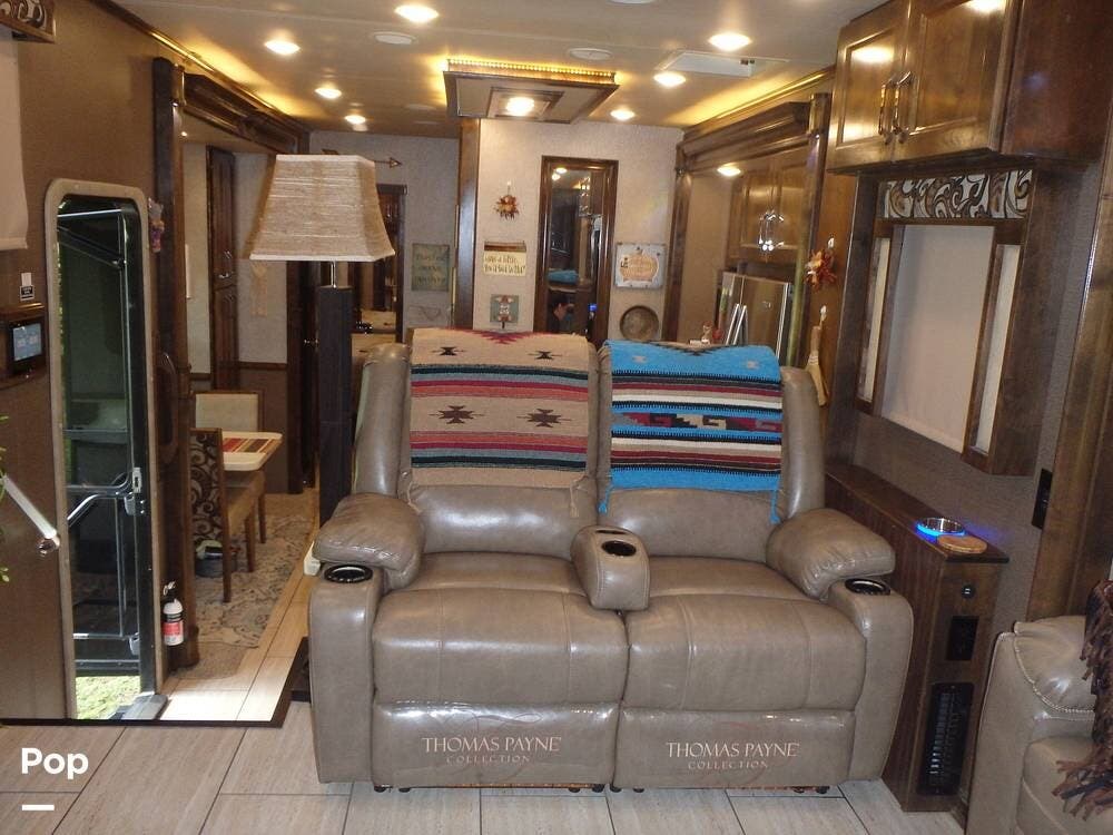 The front living area includes opposing tri-fold sofas that can convert into beds, as well as power theater seating facing a large entertainment center with a fireplace and large TV. Hardwood cabinetry, recessed LED lighting, and high-end furnishings add to the residential feel.