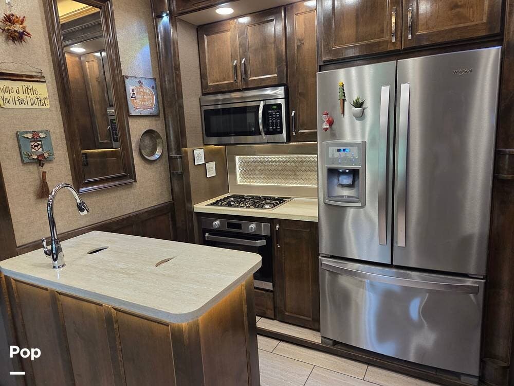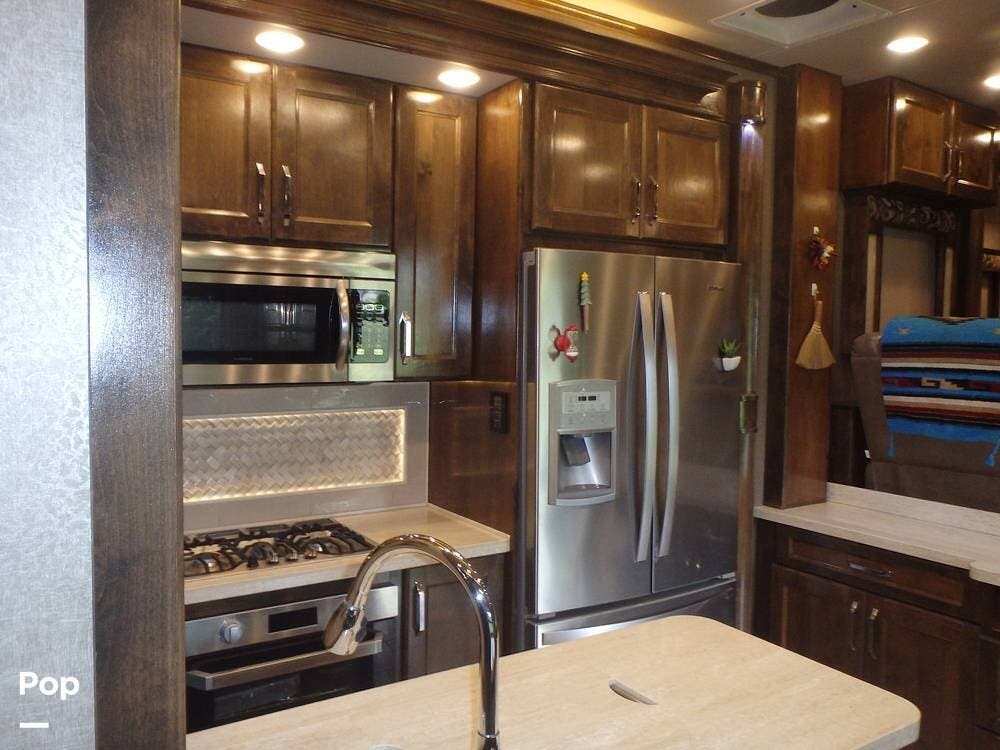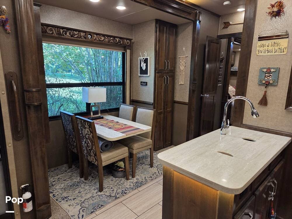 Mid-ship is a fully equipped kitchen with solid surface countertops, a large island, full-size residential refrigerator, convection microwave, oven, and a spacious pantry. A freestanding dinette provides comfortable seating for meals.