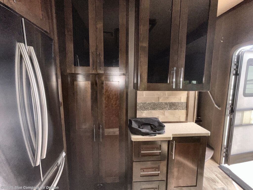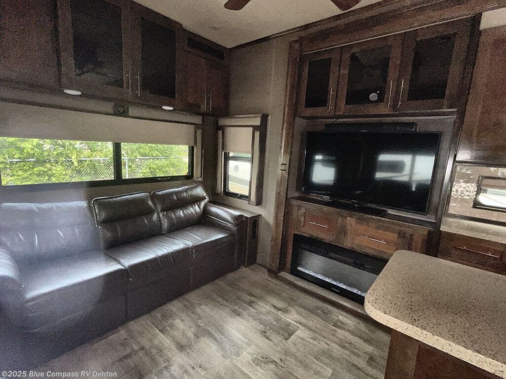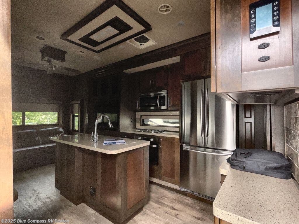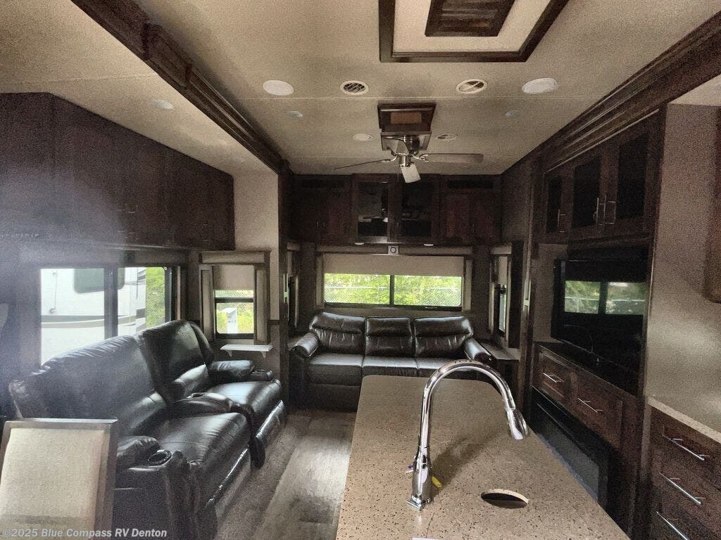 Wherever your next camping trip takes you, you will want this luxury Vilano fifth wheel to help get you there! From the three slides to the kitchen island, this unit has plenty of space and home-like comforts added throughout. In the living area you will enjoy relaxing on the 80" sofa bed or 60" theater seating while you cozy up in front of the fireplace or watch a movie on the 50" LED TV, and if you get hungry for a late-night snack while you are watching your favorite program, you won't have to miss a single second of the action because you can quickly grab a cold beverage from the 18 cubic foot French door refrigerator in the joining kitchen area.