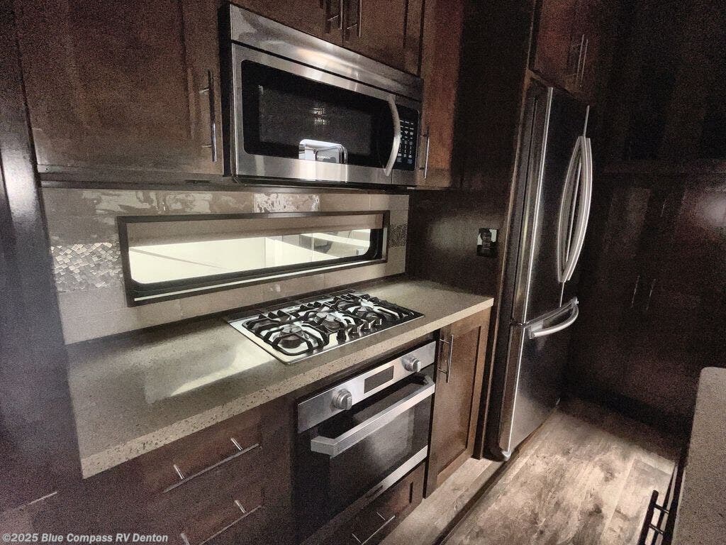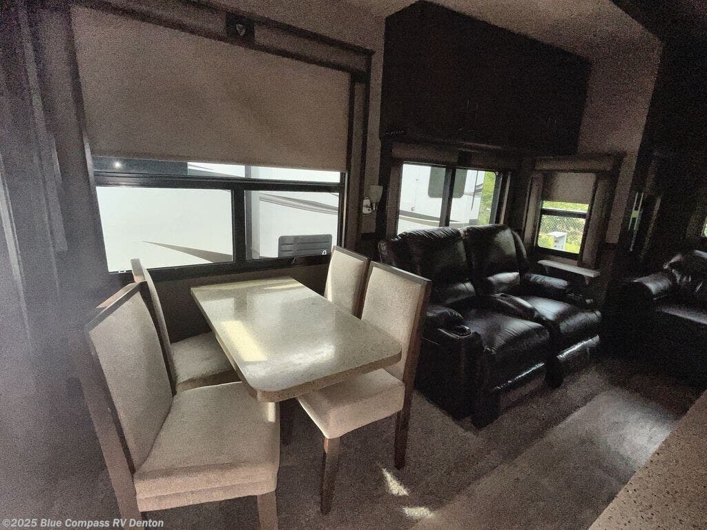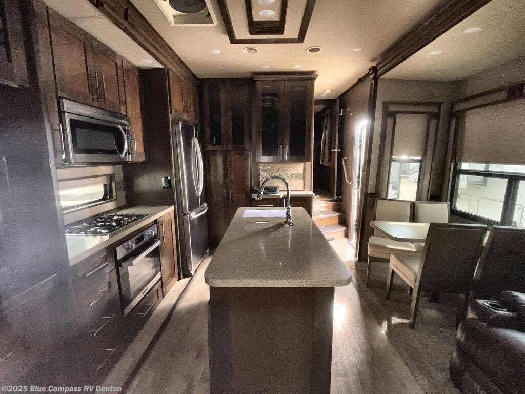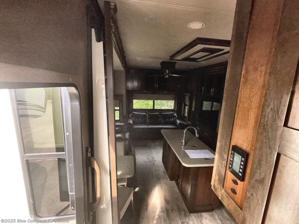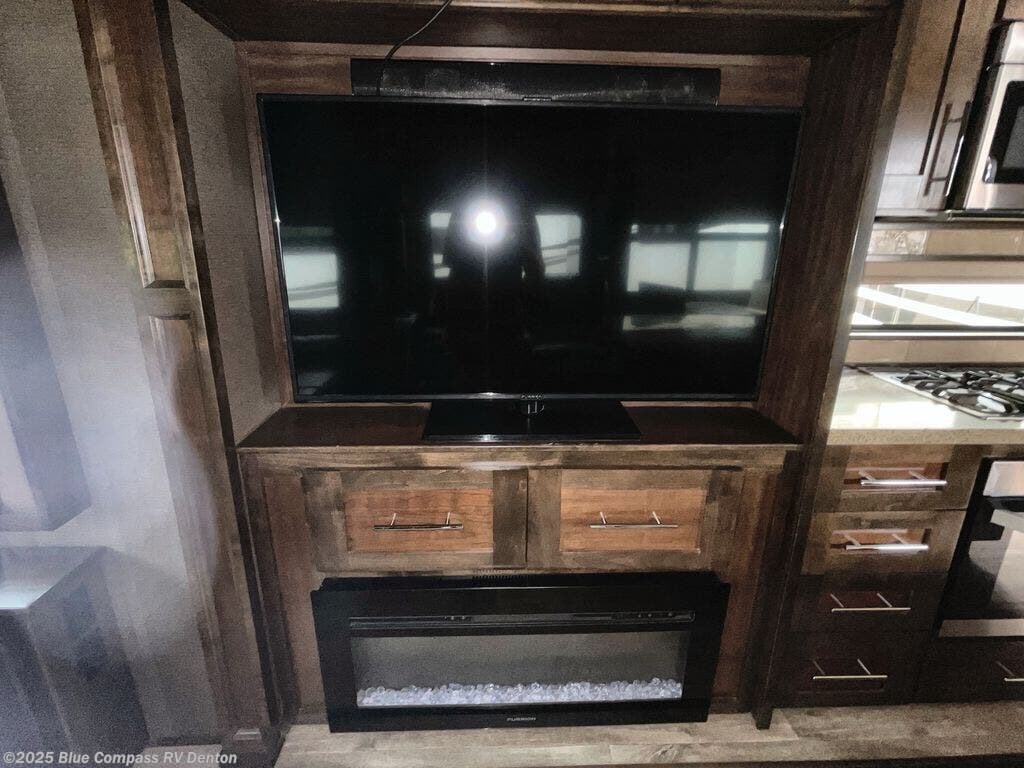 Wherever your next camping trip takes you, you will want this luxury Vilano fifth wheel to help get you there! From the three slides to the kitchen island, this unit has plenty of space and home-like comforts added throughout. In the living area you will enjoy relaxing on the 80" sofa bed or 60" theater seating while you cozy up in front of the fireplace or watch a movie on the 50" LED TV, and if you get hungry for a late-night snack while you are watching your favorite program, you won't have to miss a single second of the action because you can quickly grab a cold beverage from the 18 cubic foot French door refrigerator in the joining kitchen area.