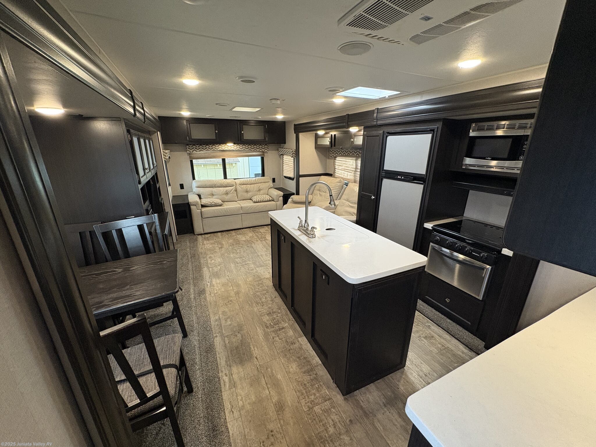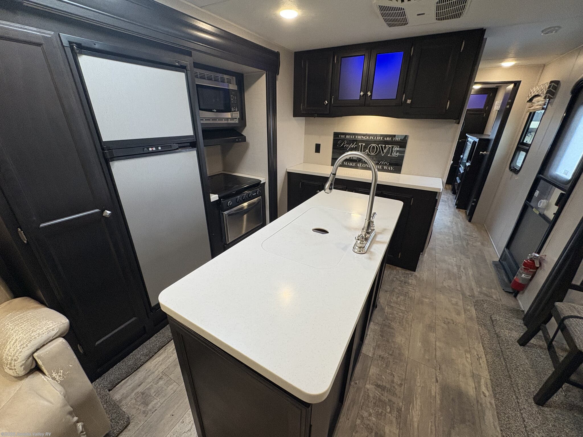 This RV is designed for home-style convenience on the road, featuring a full kitchen that includes: