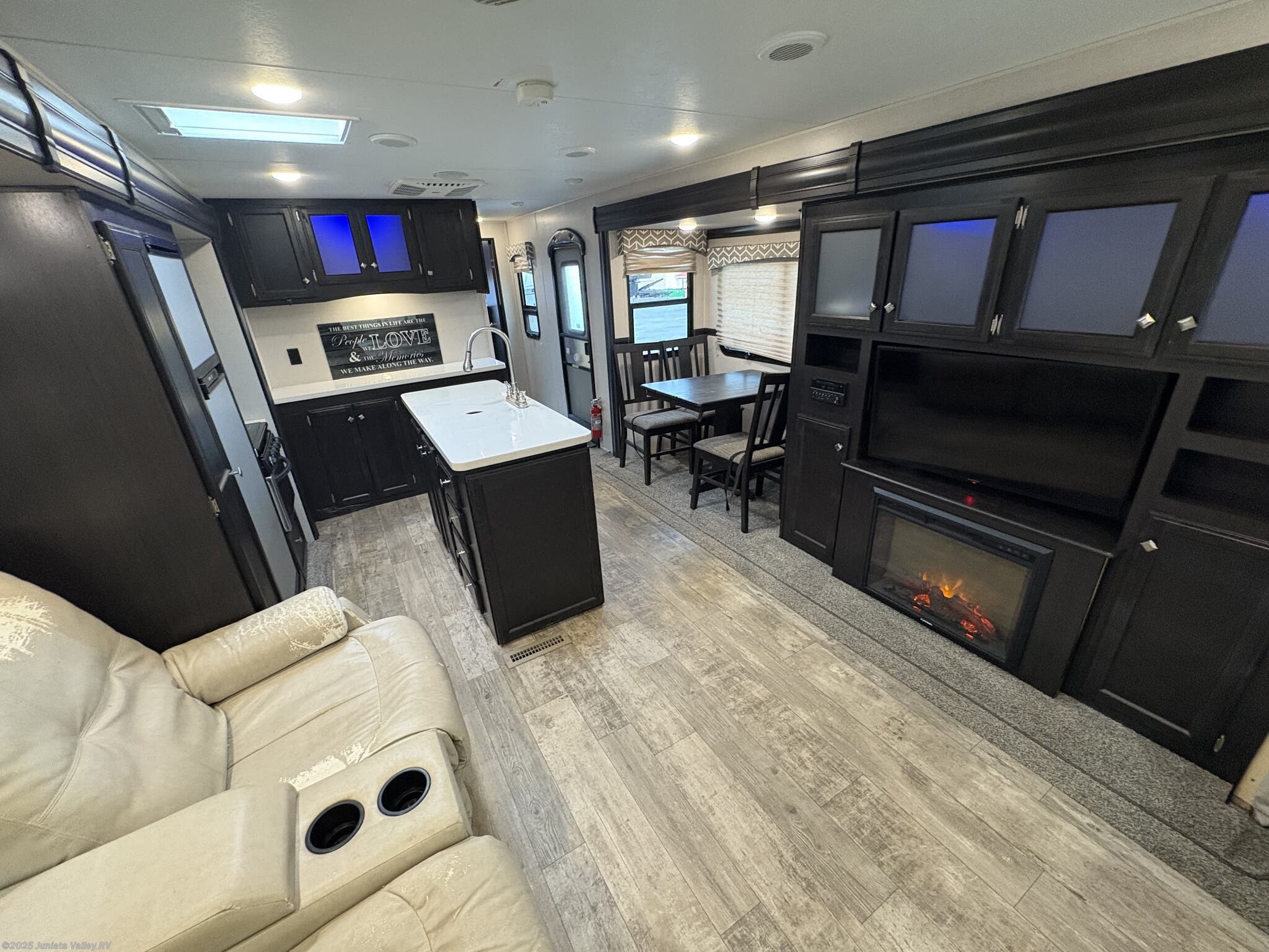 Fireplace, Free Standing Dinette w/Chairs, Island Kitchen, King Size Bed, Kitchen Sink, Medicine Cabinet, Non-Smoking Unit, Overhead Cabinetry, Pantry, Pet Friendly, Pleated Shades, Roof Vents, Self Contained, Shower, Sofa Bed, Solid Surface Countertops, Table and Chairs, Theater Seating, Toilet, Vanity, Wardrobe(s)
