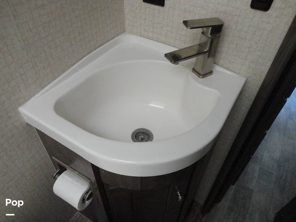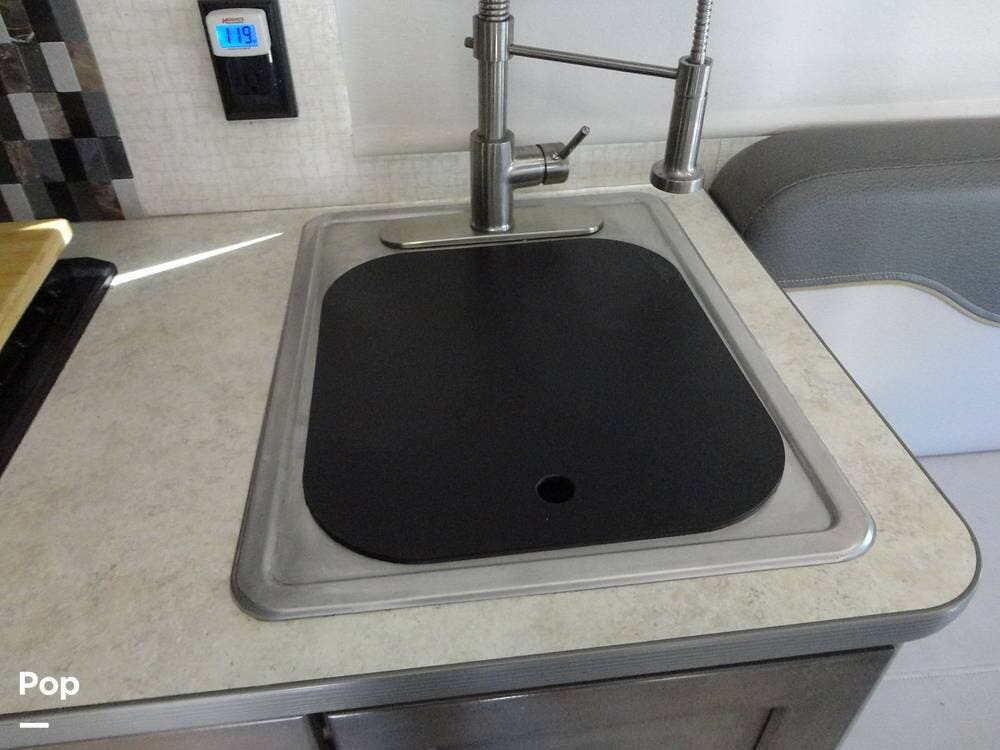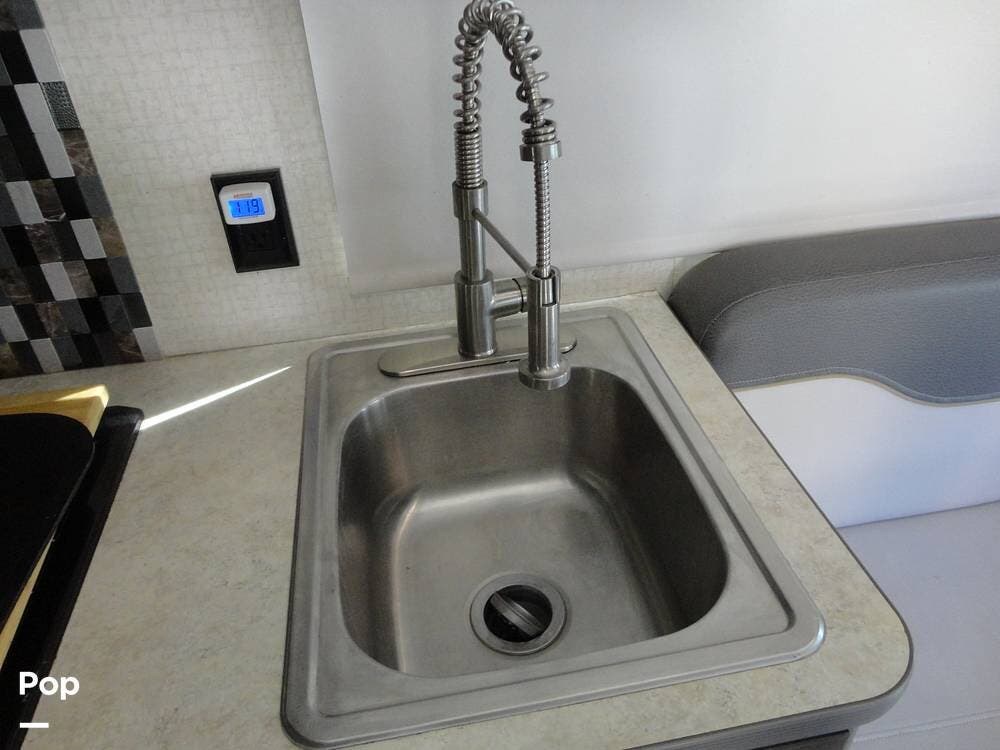 This 2018 Winnebago Fuse 23T has a complete kitchen with a 12-volt refrigerator/freezer, stainless sink, microwave oven, and three-burner stove top.