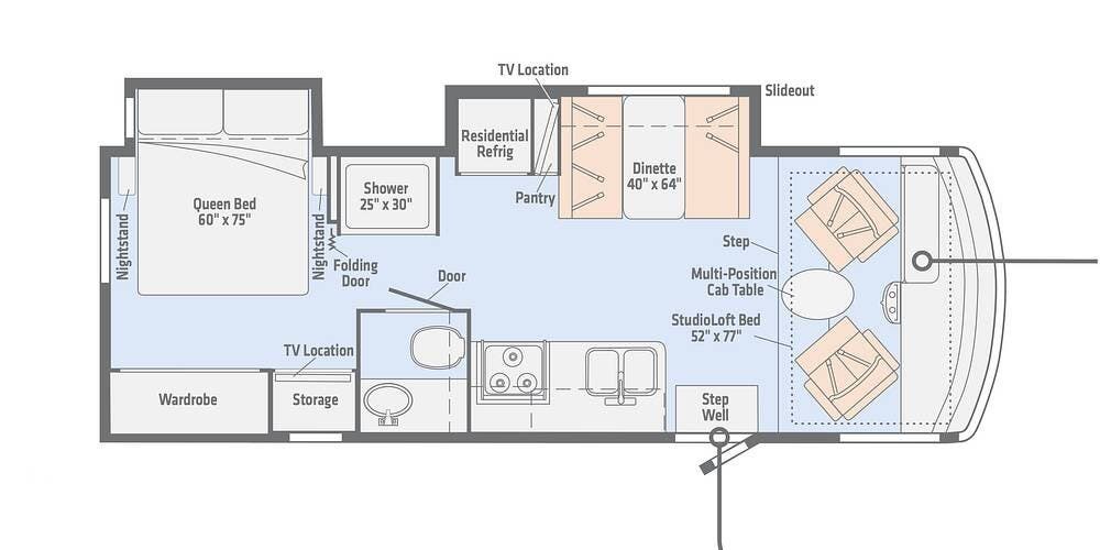 The kitchen is well-equipped and offers everything you need to make great meals. You can have meals while watching TV or chatting about the day's adventures. This RV will give you access to national parks and almost anywhere you want to go.