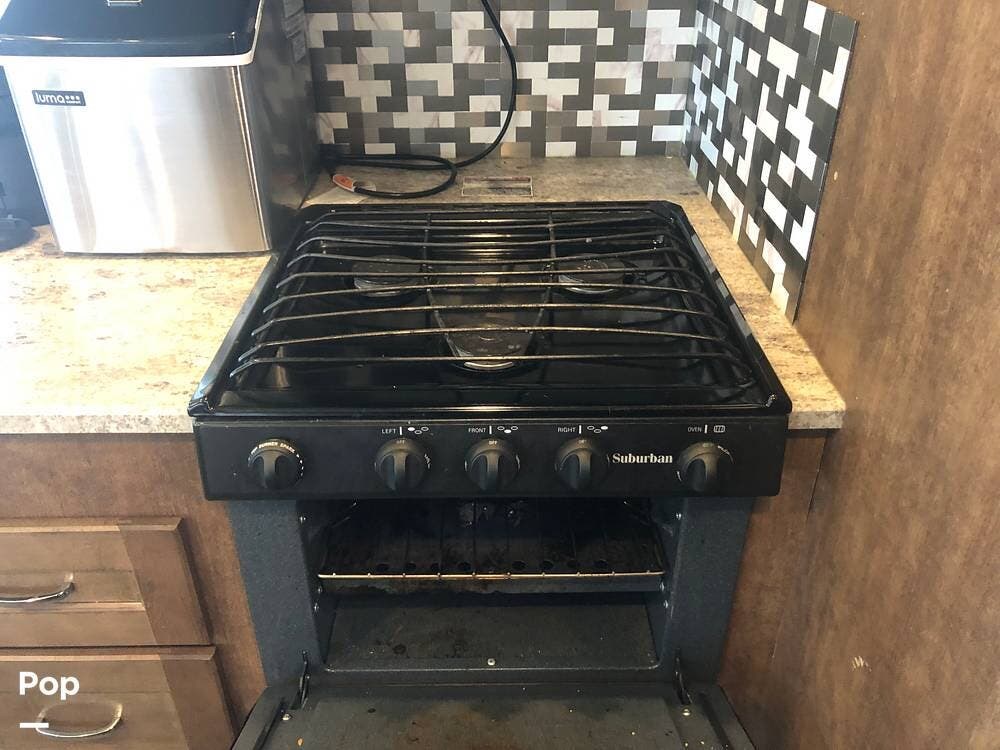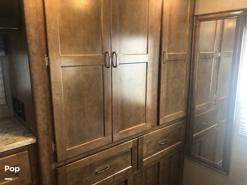 The fully equipped kitchen is perfect for preparing meals on the road. It features a three-burner stove, an oven, a touch-control microwave, a double-door refrigerator/freezer, and a spacious pantry for storage. The countertops are stylish and durable, paired with a decorative backsplash that adds a touch of elegance. A deep stainless steel double sink makes cleanup a breeze, while the powered roof ventilator fan keeps air circulating for a fresh cooking environment.