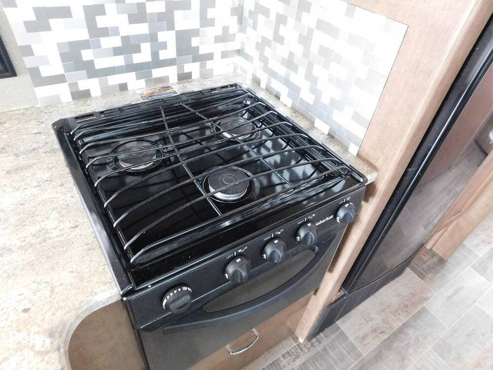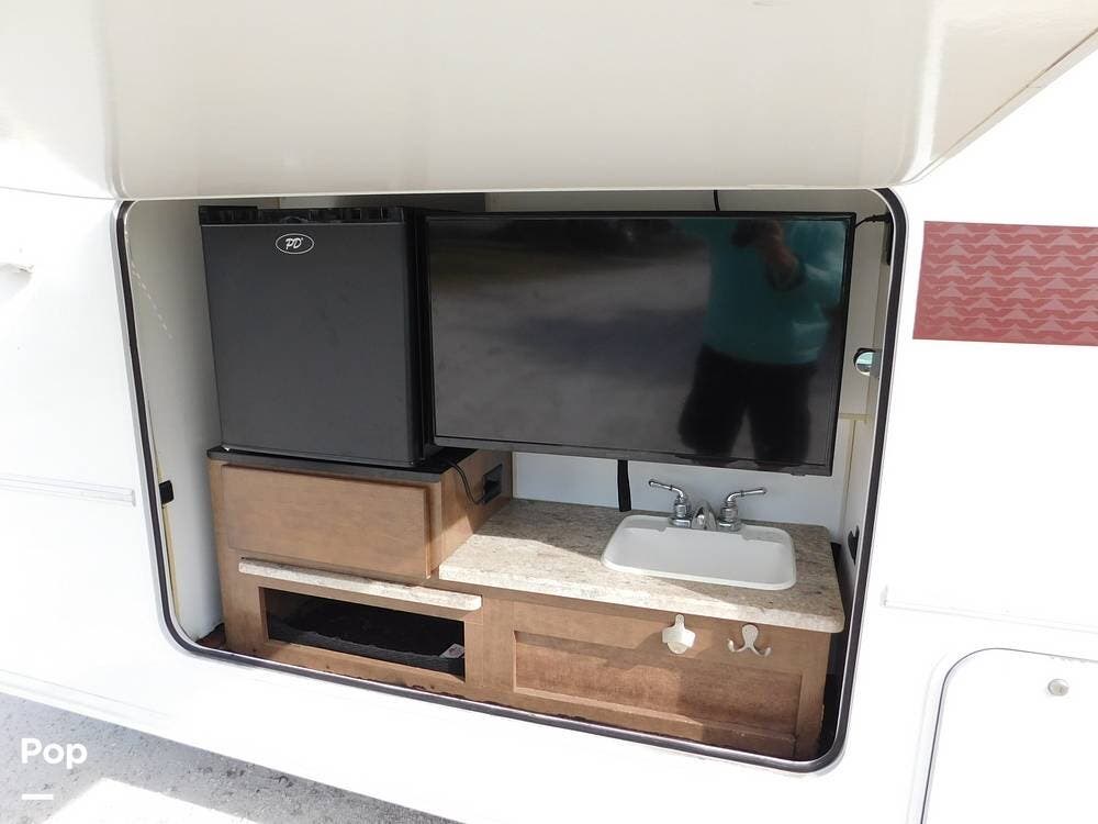 The Intent has two slides and a large awning that covers the outdoor kitchen, complete with a TV.