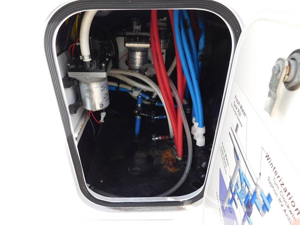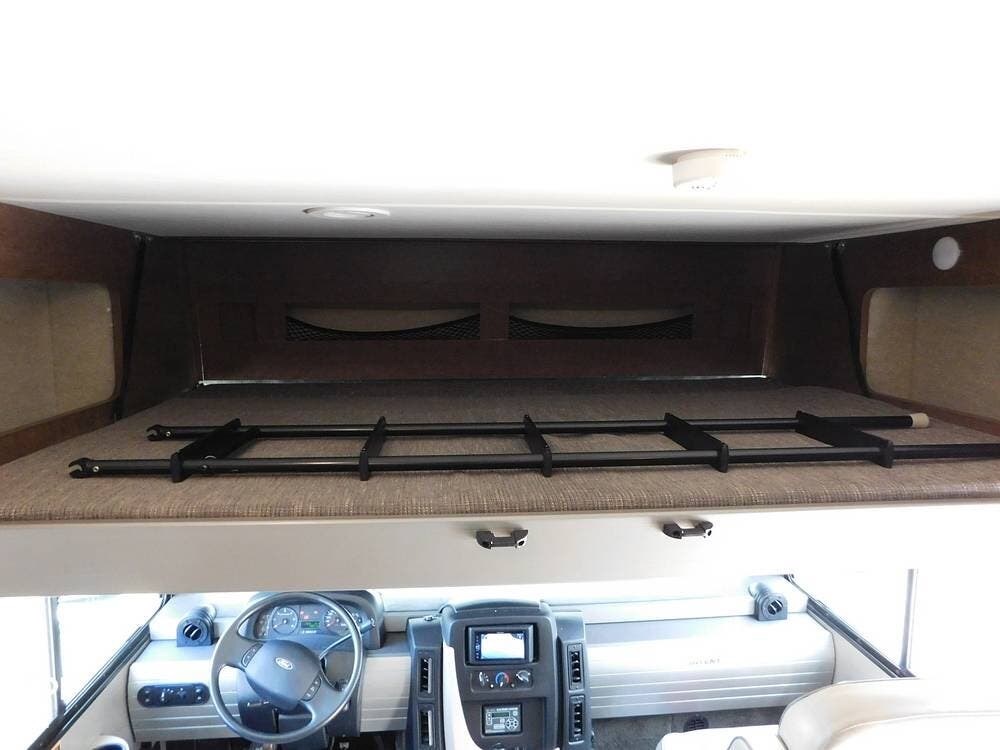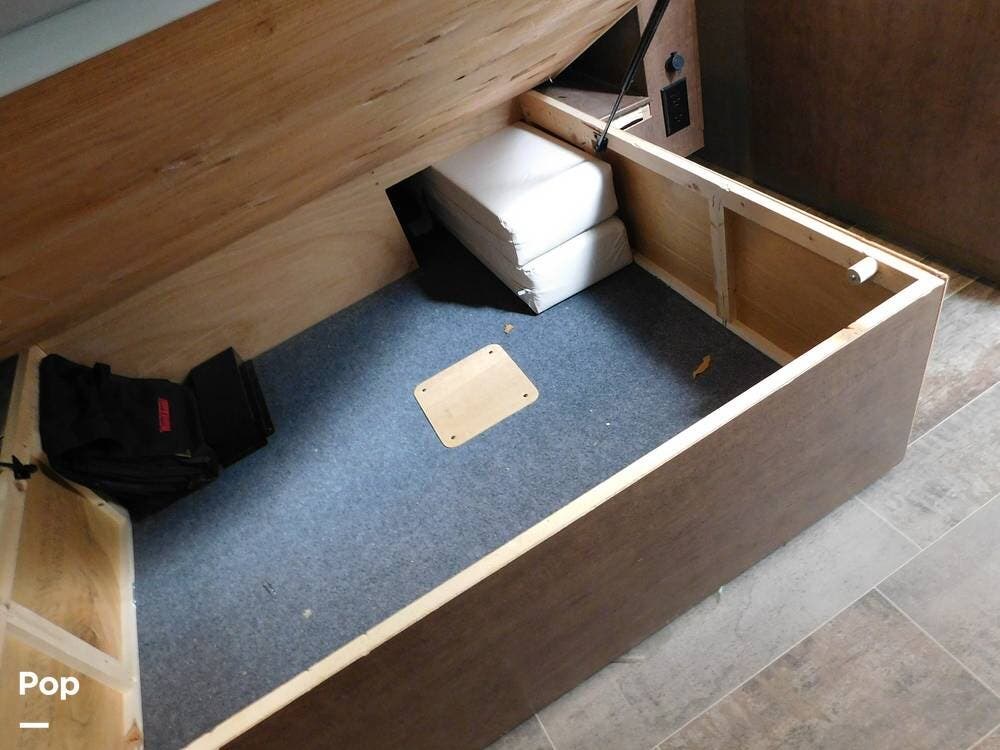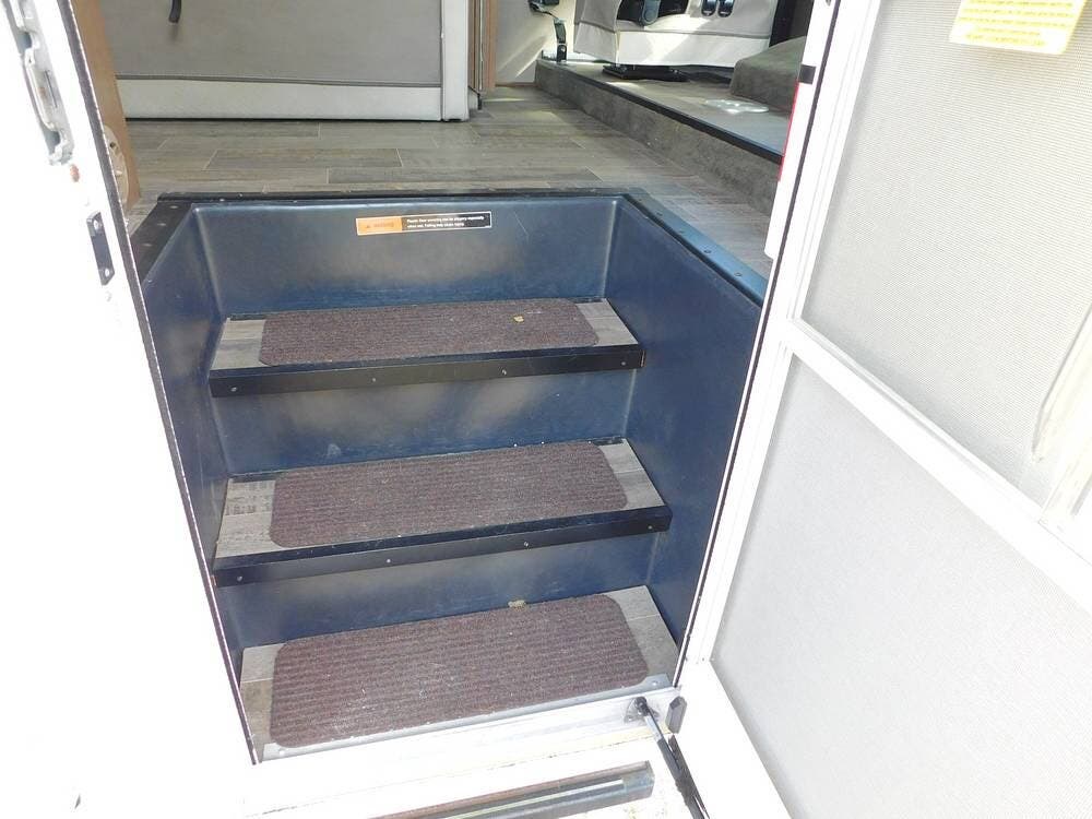 The bathroom is divided so that someone can shower without tying up the bathroom. There is ample storage in the bedroom closets and under the bed, as well as a removable table between the captain's chairs.