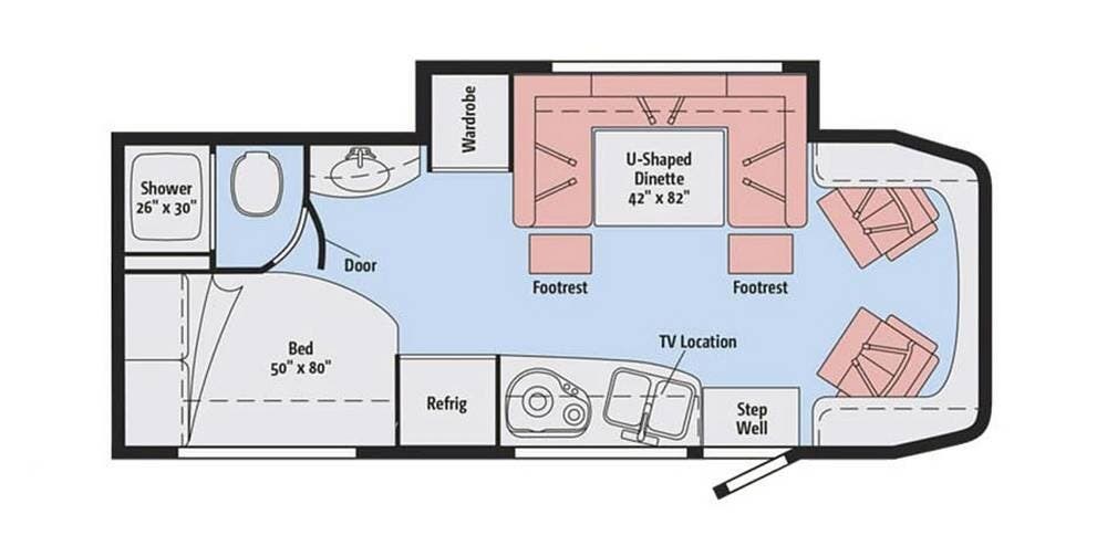 Sleeps six with a 50"x80" bed in the back corner, a bunk over the cab, and a U-shaped dinette sleeper.