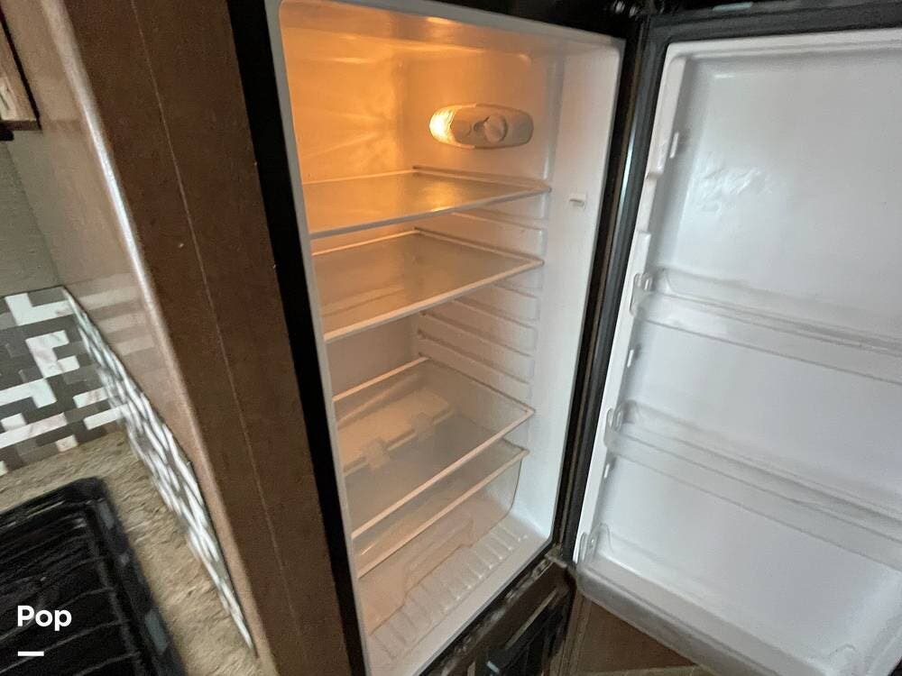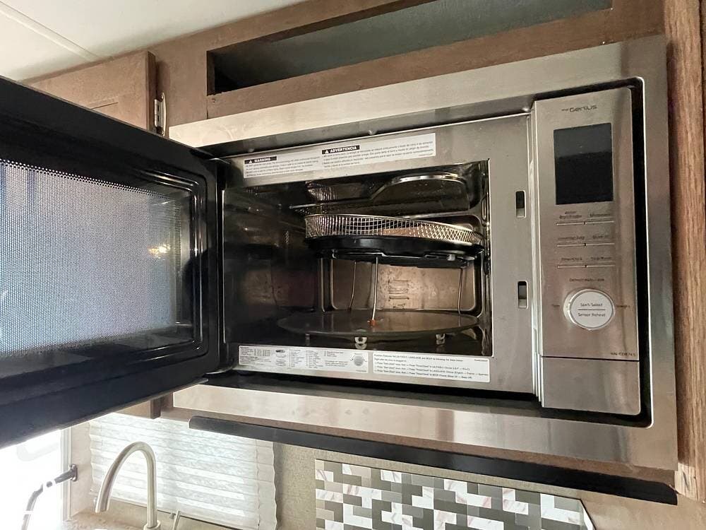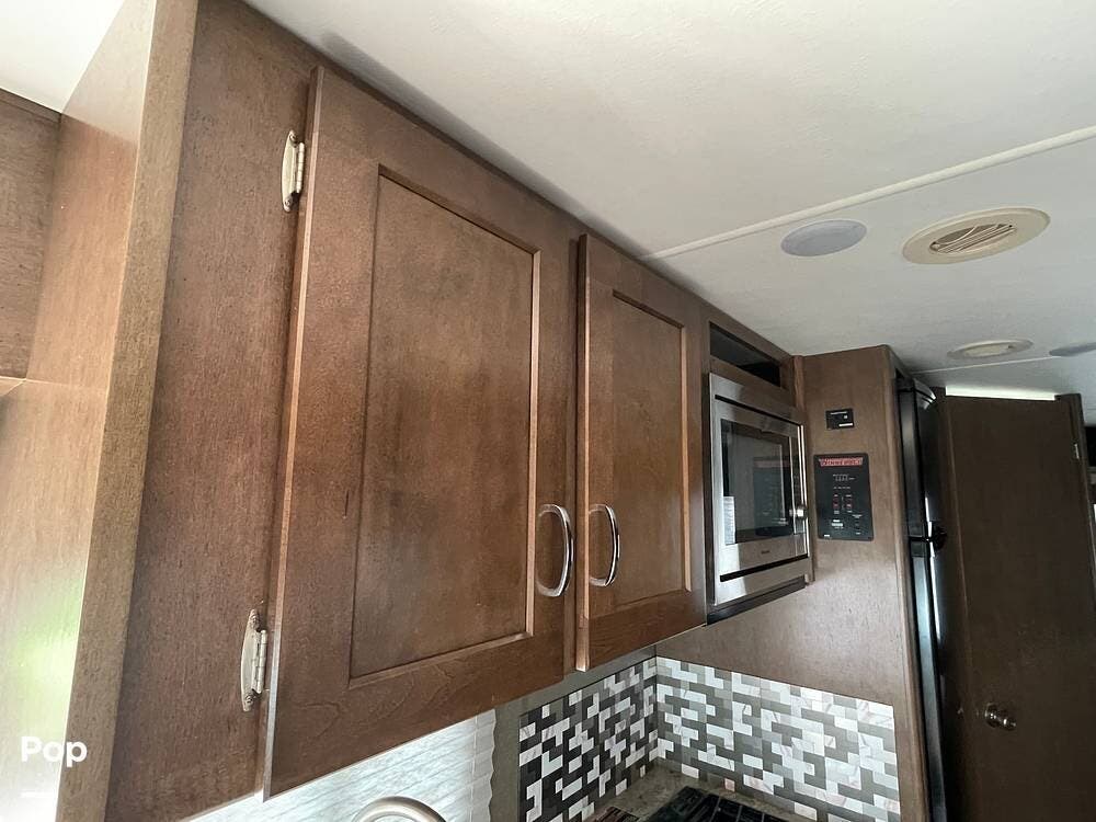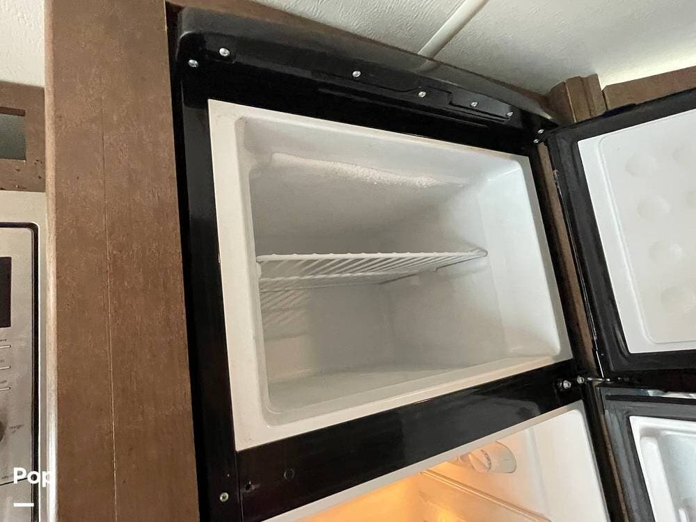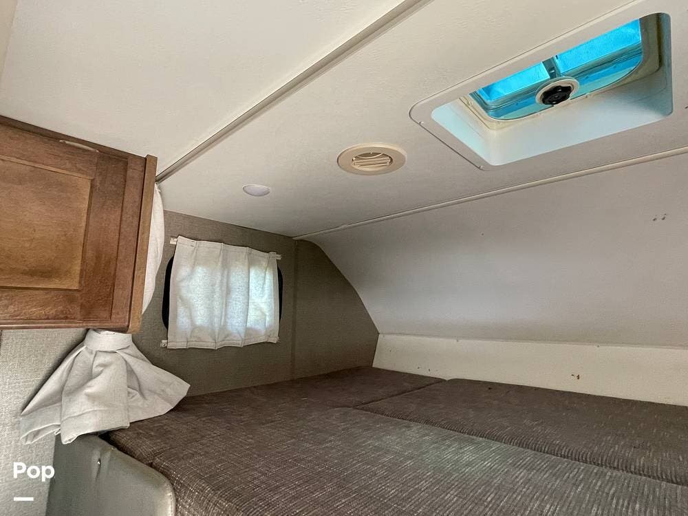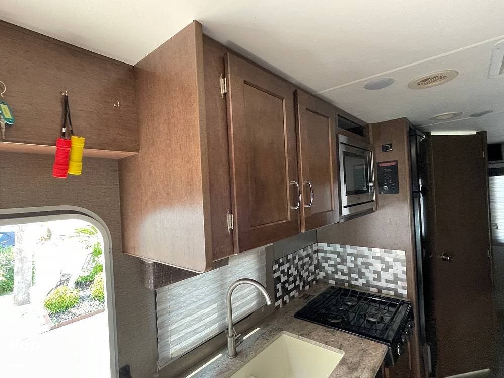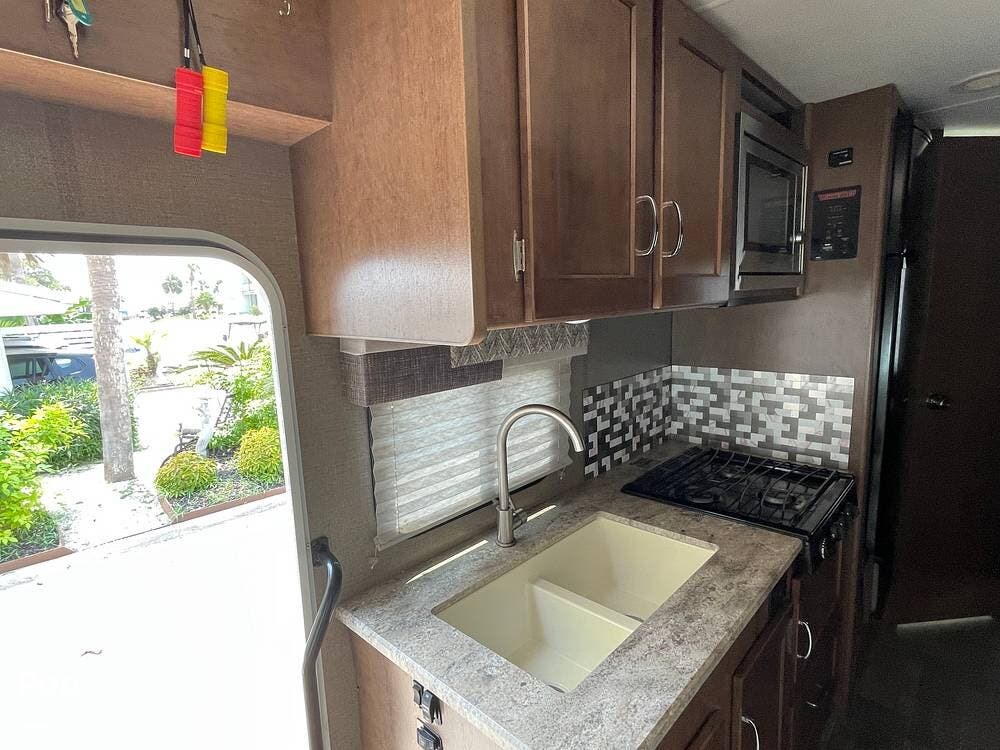 The Outlook 22C's interior is thoughtfully designed to maximize space and functionality. It features a well-appointed living area with a convertible dinette that provides both dining and sleeping accommodations. The galley is equipped with essential appliances, including a refrigerator, microwave, three-burner stove, and double sink, ensuring that meal preparation on the road is hassle-free.