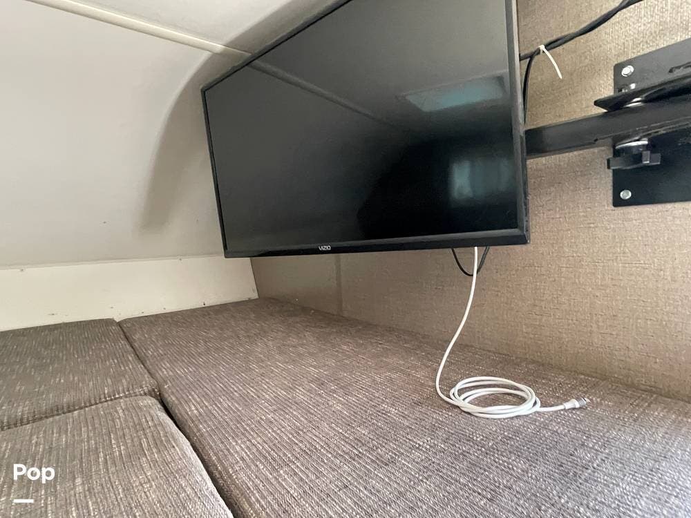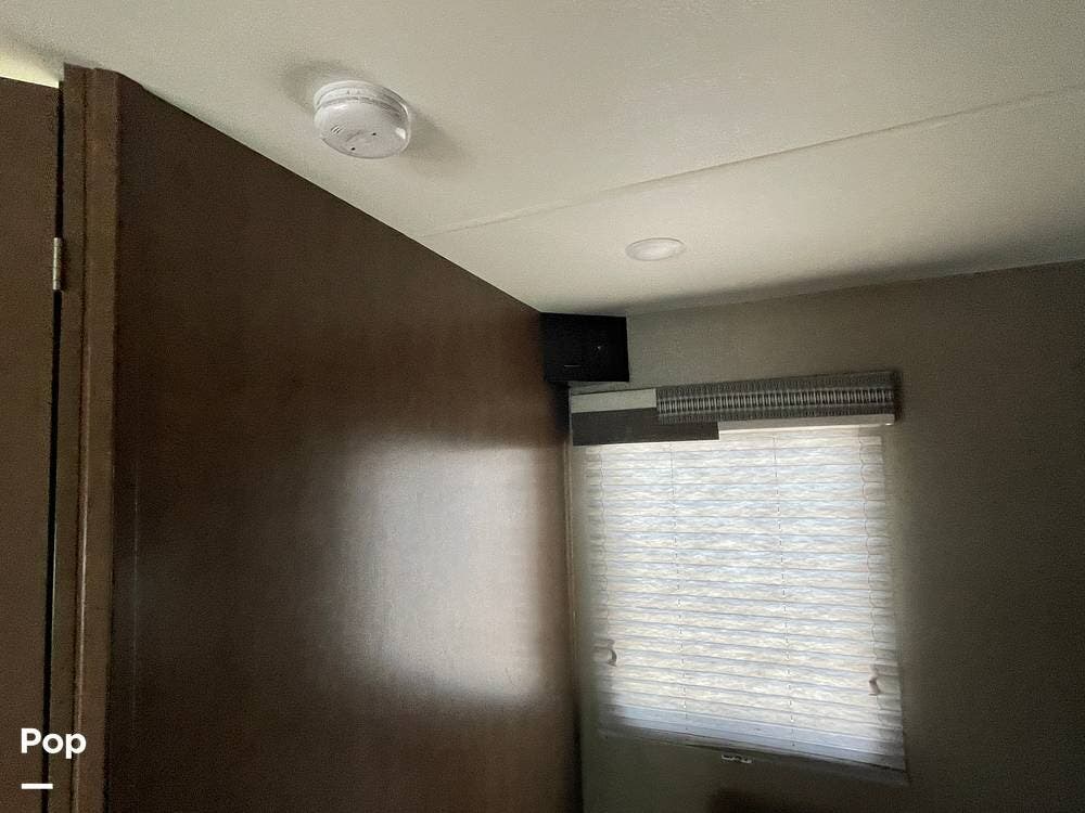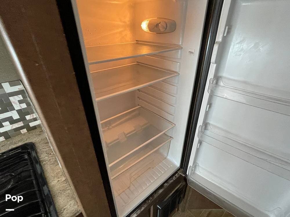 Additional features include a built-in entertainment system, air conditioning, and heating, ensuring comfort in various climates. The exterior is designed with practical amenities such as an electric awning, exterior storage compartments, and a durable fiberglass body that combines aesthetics with durability.