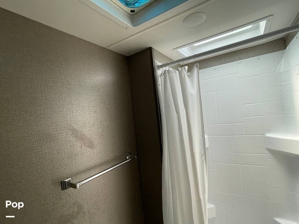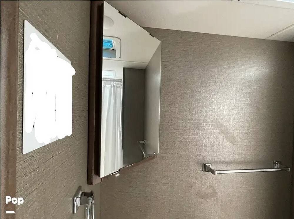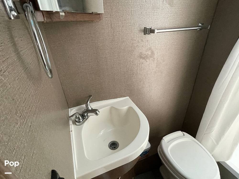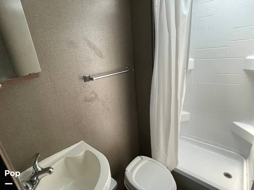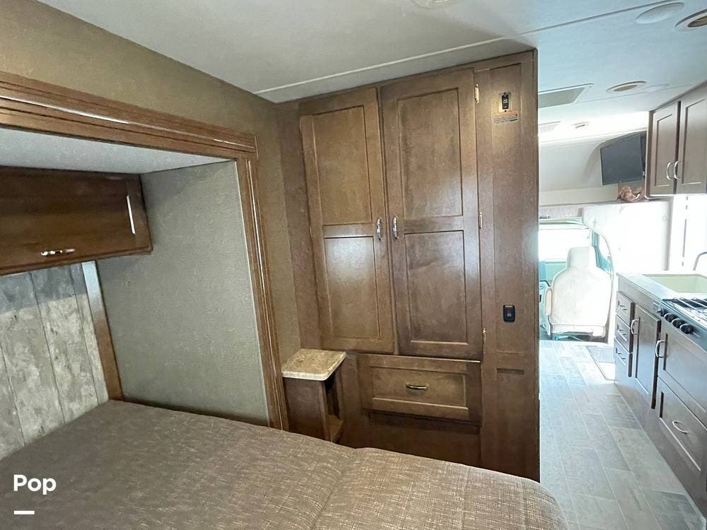 The sleeping arrangements include a rear corner bed with overhead storage and a cab-over bunk, offering comfortable sleeping space for up to six people. The motorhome also boasts a full bathroom with a shower, toilet, and sink, providing all the necessities for a self-contained living experience. Ample storage is available inside and out, allowing travelers to bring all their essentials and more.