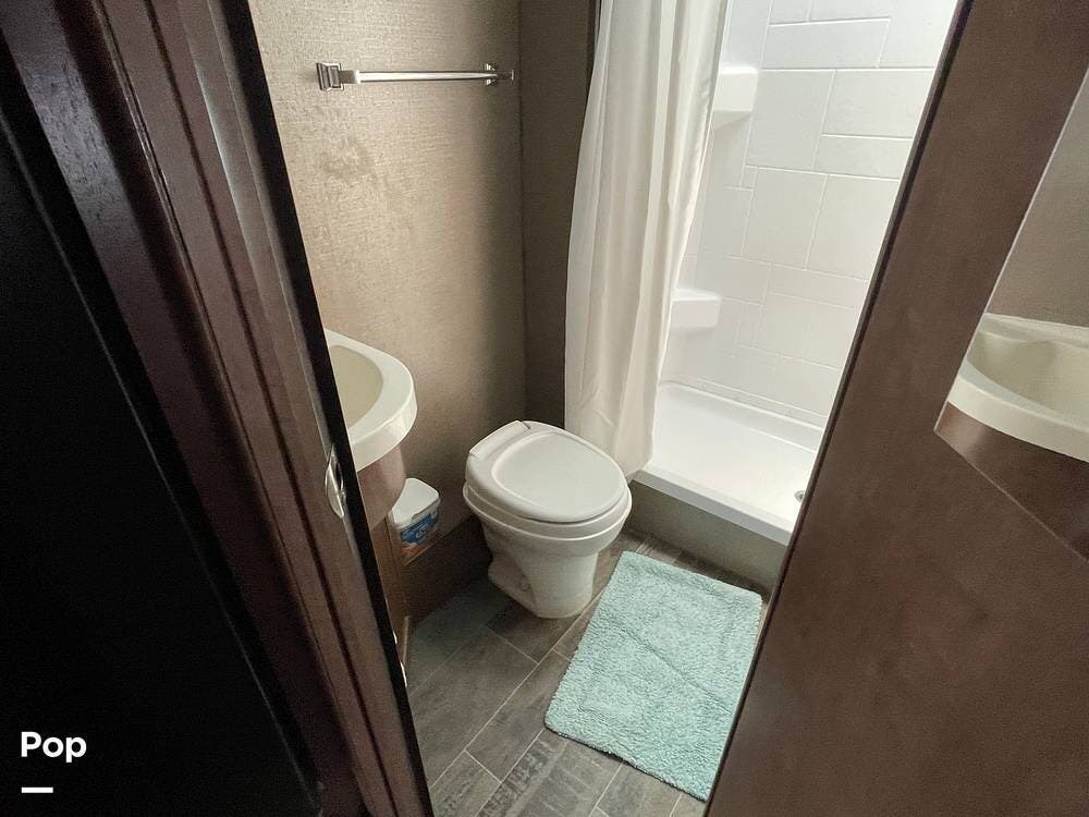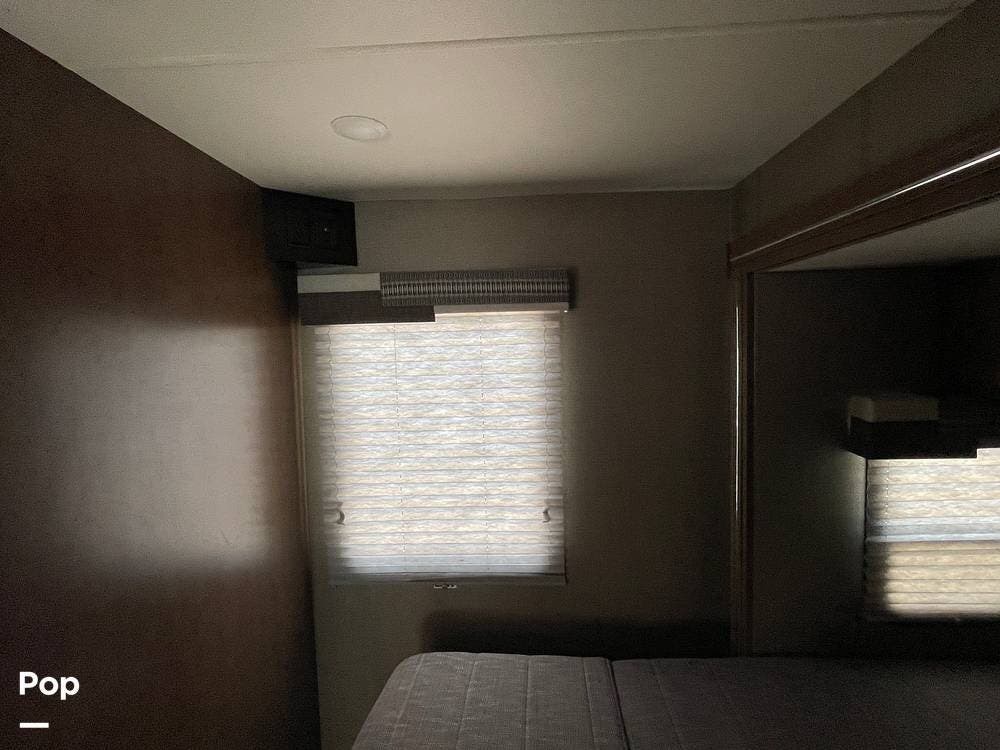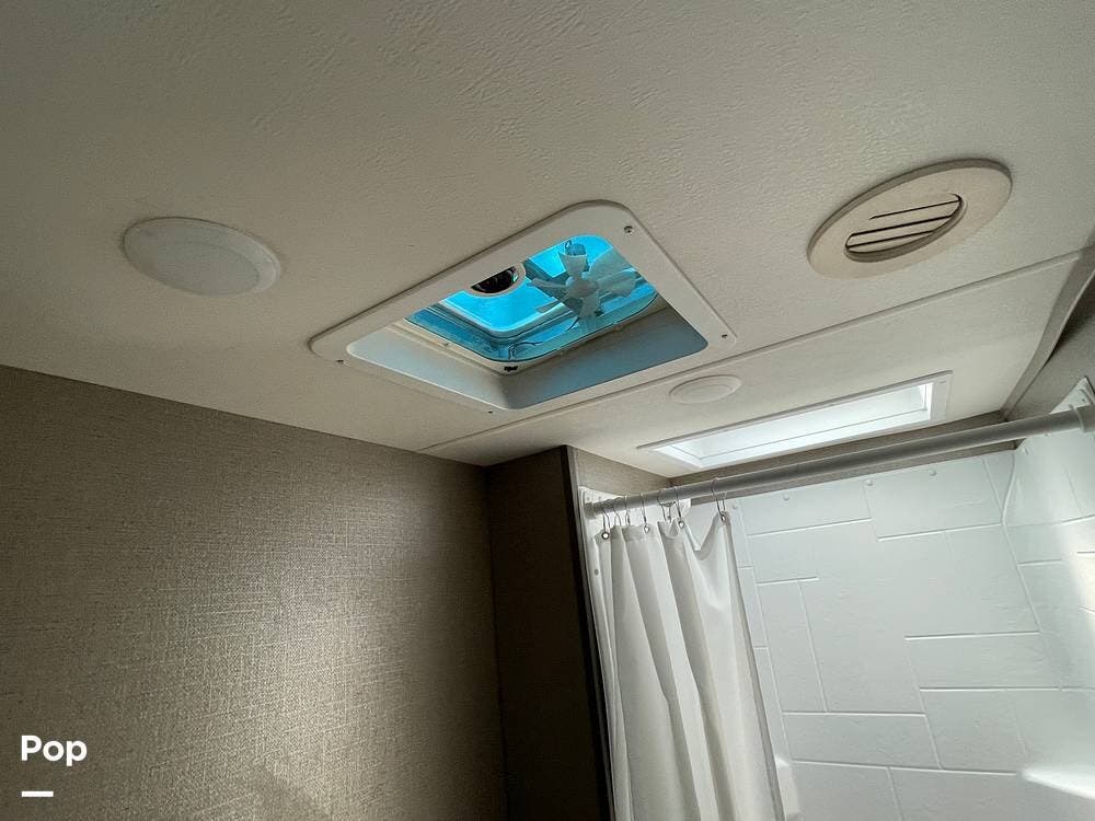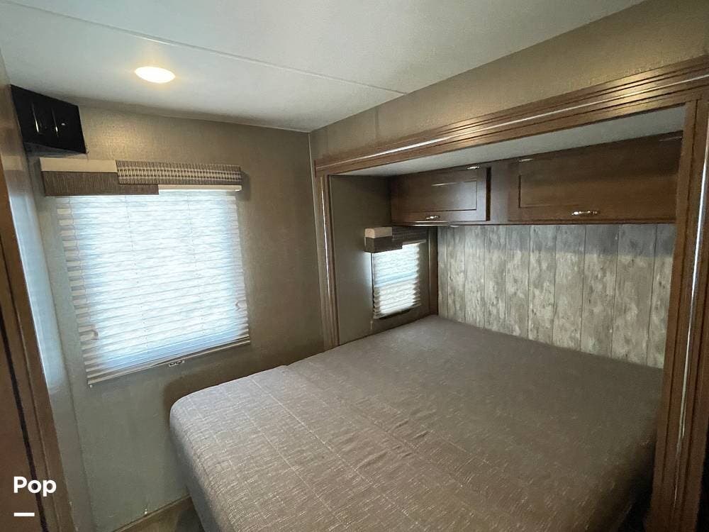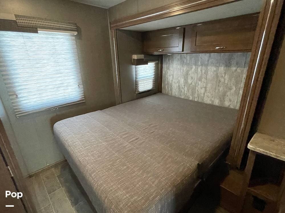 The sleeping arrangements include a rear corner bed with overhead storage and a cab-over bunk, offering comfortable sleeping space for up to six people. The motorhome also boasts a full bathroom with a shower, toilet, and sink, providing all the necessities for a self-contained living experience. Ample storage is available inside and out, allowing travelers to bring all their essentials and more.